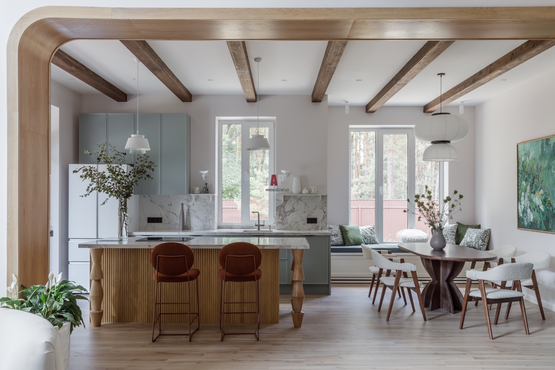 Зона кухни отделена широким арочным проемом с порталом из шпона дерева. Кухонная мебель включает остров с варочную поверхностью и встроенной вытяжкой, рабочую зону с мойкой под окном, шкафы и большой холодильник Side by side.