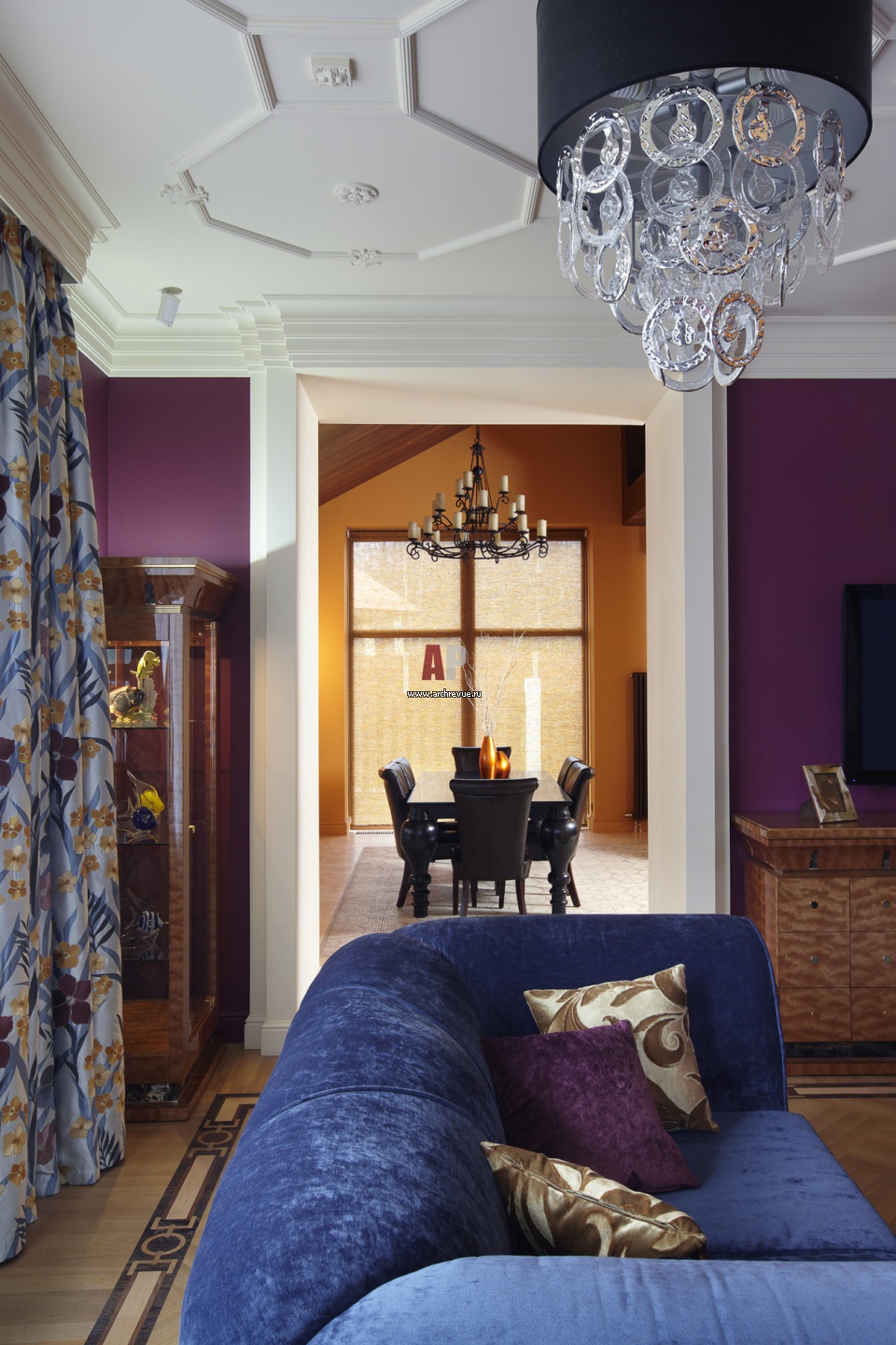 Гостиная объединена со столовой с помощью широкого портала. Он акцентирован лаконичной ступенчатой лепниной в стиле ар-деко.