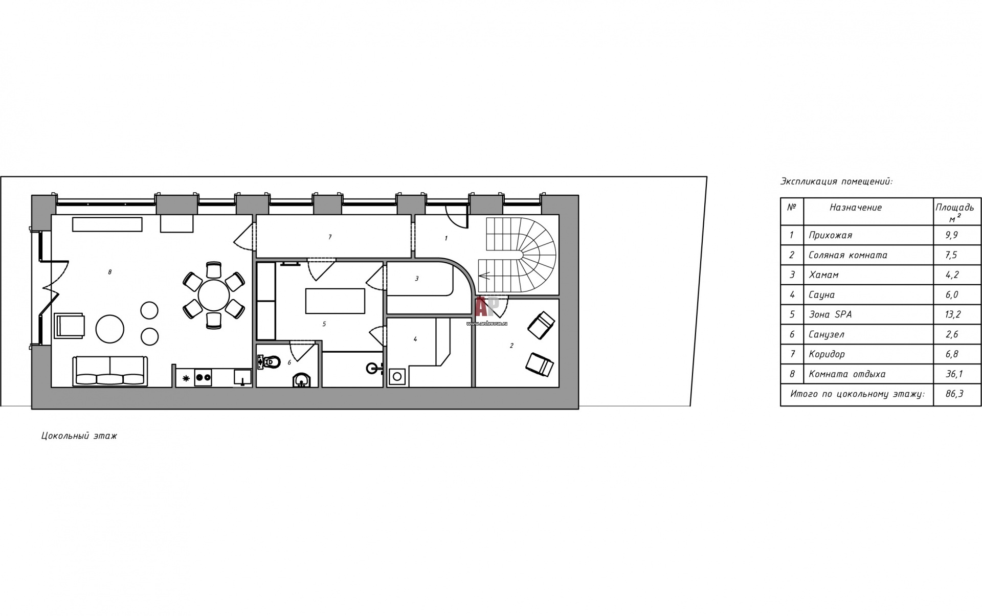 Планировка цокольного этажа 2-х этажного дома с эксплуатируемым цоколем площадью 600 кв. м.