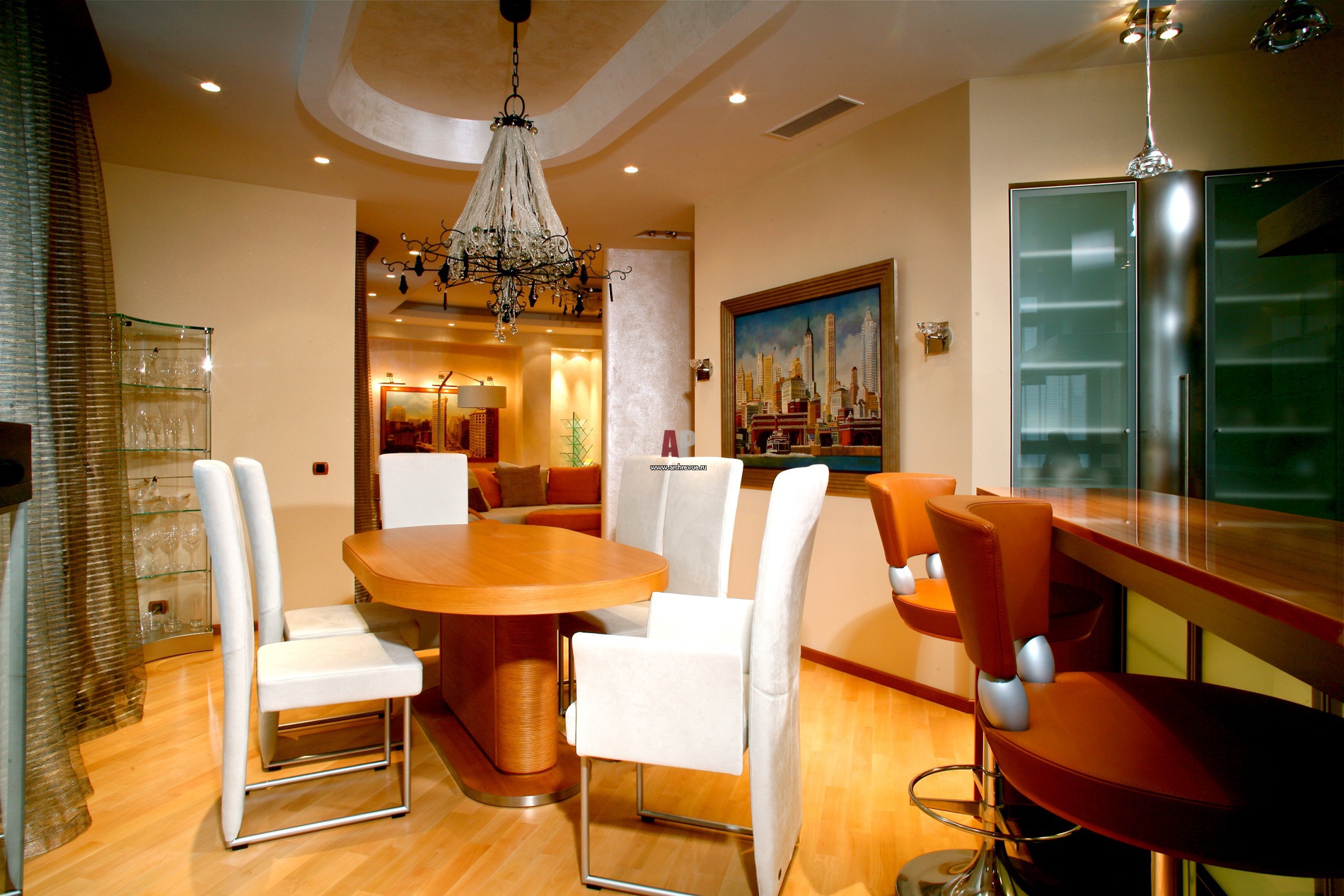 На переднем плане – барные стулья Giorgetti в стиле ар-деко. За ними – столовая группа и гостиная. Гостиная и столовая условно зонированы межкомнатной полукруглой перегородкой, которая была спроектирована архитектором, чтобы скрыть несущую колонну.