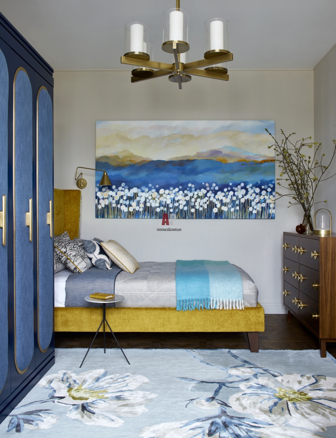 Интерьер комнаты дочери. Шкаф, кровать, комод – все по эскизам дизайнера. Столик около кровати, Baxter. Ковер, Designers Guild. Картина – художник Даша Щелочилина.
