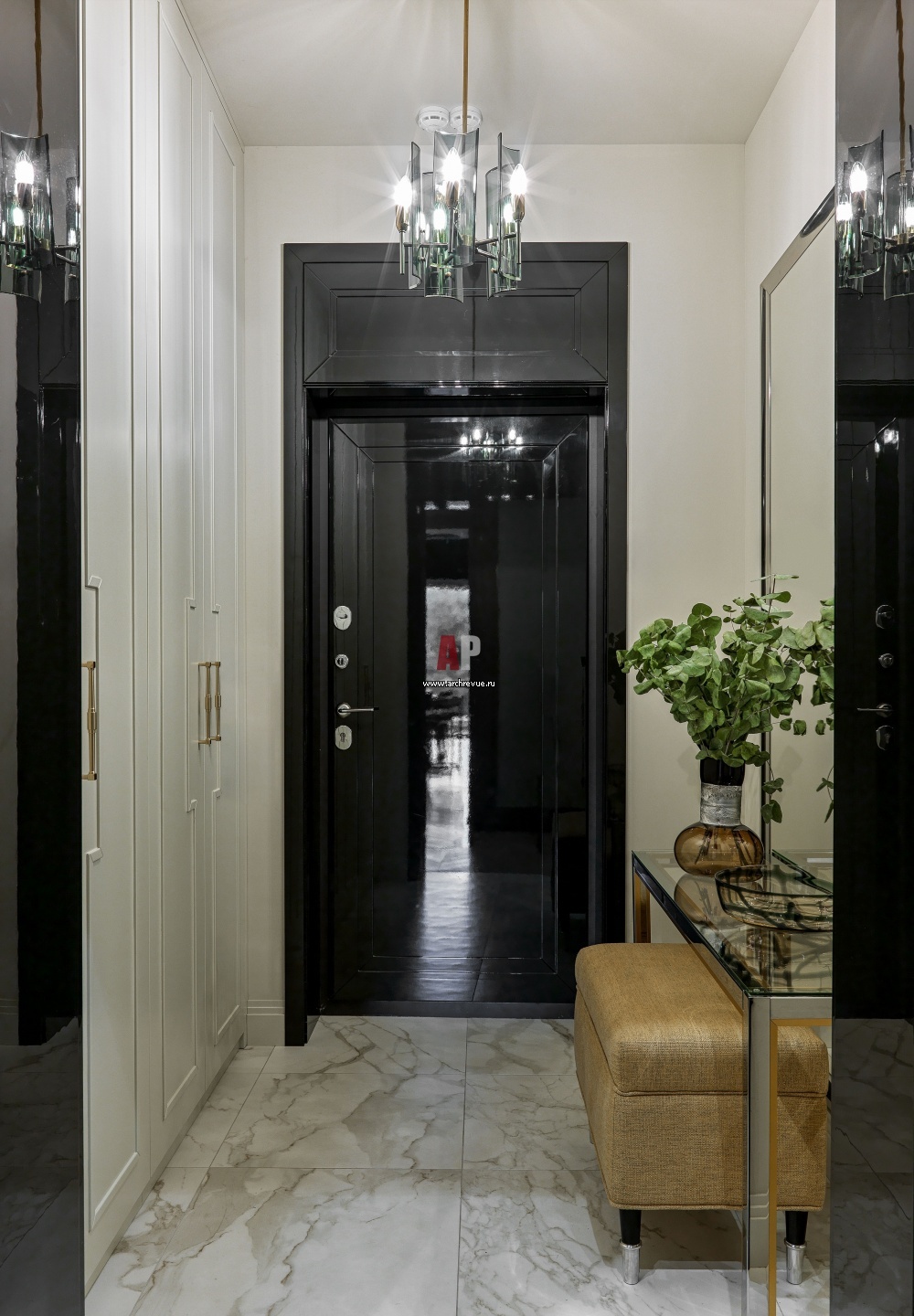 Московская квартира с европейским декором. Интерьер прихожей. Парадный настрой в интерьере создают межкомнатные двери с высокими фрамугами из черного дерева с суперглянцем. На полу – керамогранит, Casalgrande Padana, коллекция Marmoker, Statuario Grigio.
