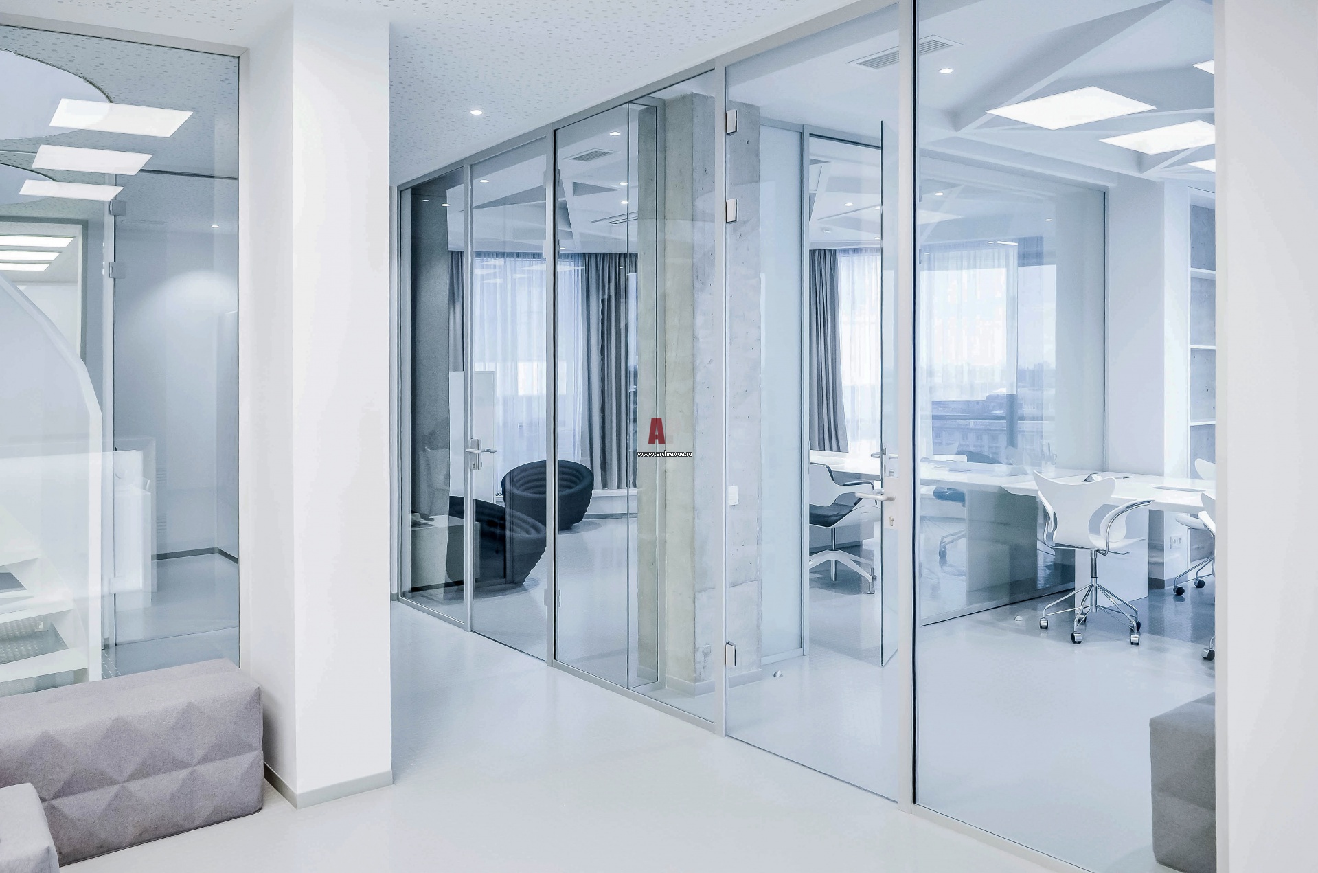 Кабинеты руководителей и переговорные «растворяются» в общем пространстве офиса благодаря «умным» прозрачным перегородкам с переменной прозрачностью.