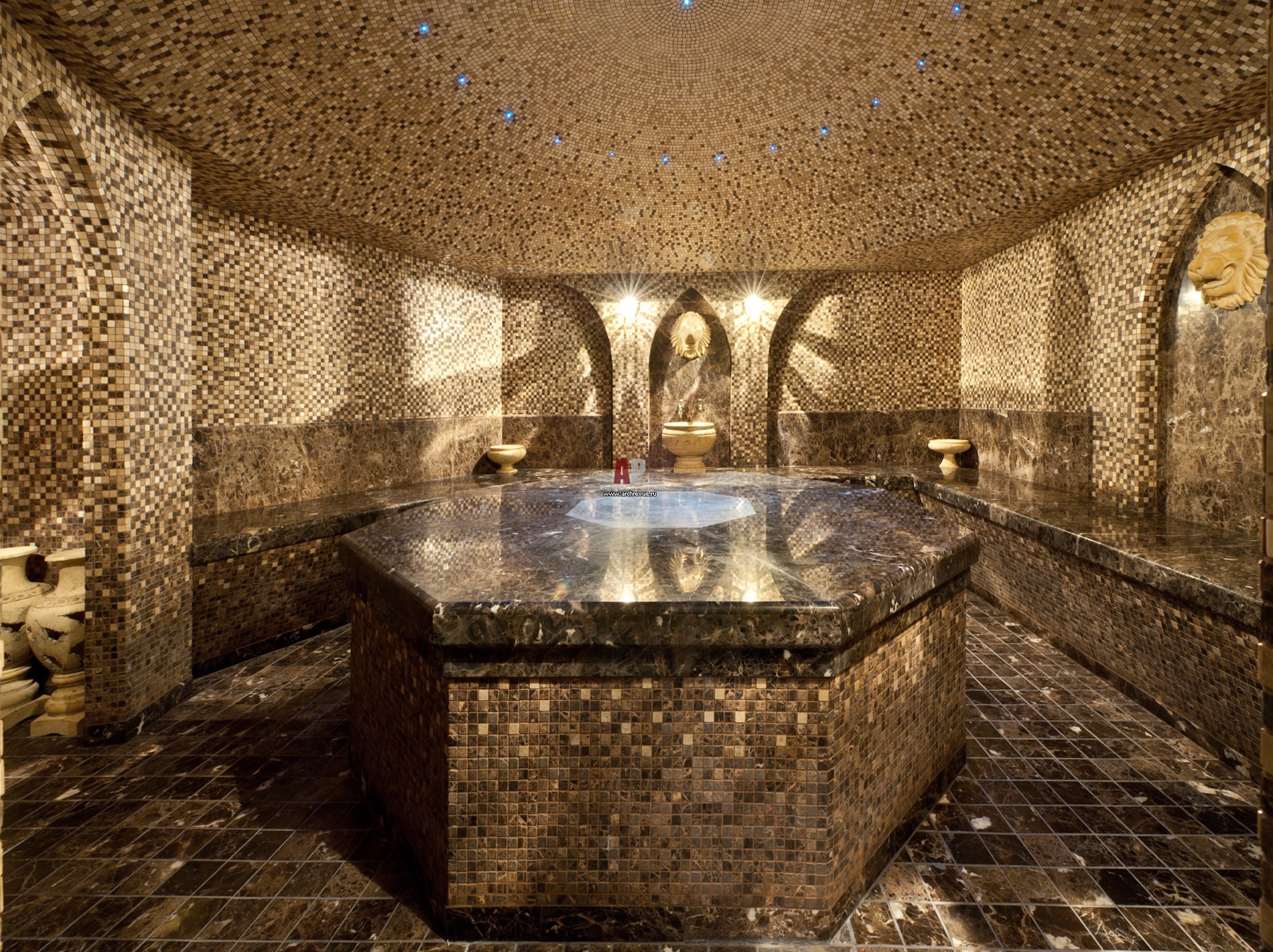 Хаммам в цокольном этаже. Весь объем помещения выложен глянцевой и матовой мозаикой, взятой в равных пропорциях. На потоке – светодиодные фонари, они меняют цвет. На полу – камень в технике римского старения, нарезанный на плиты 10Х10 см.