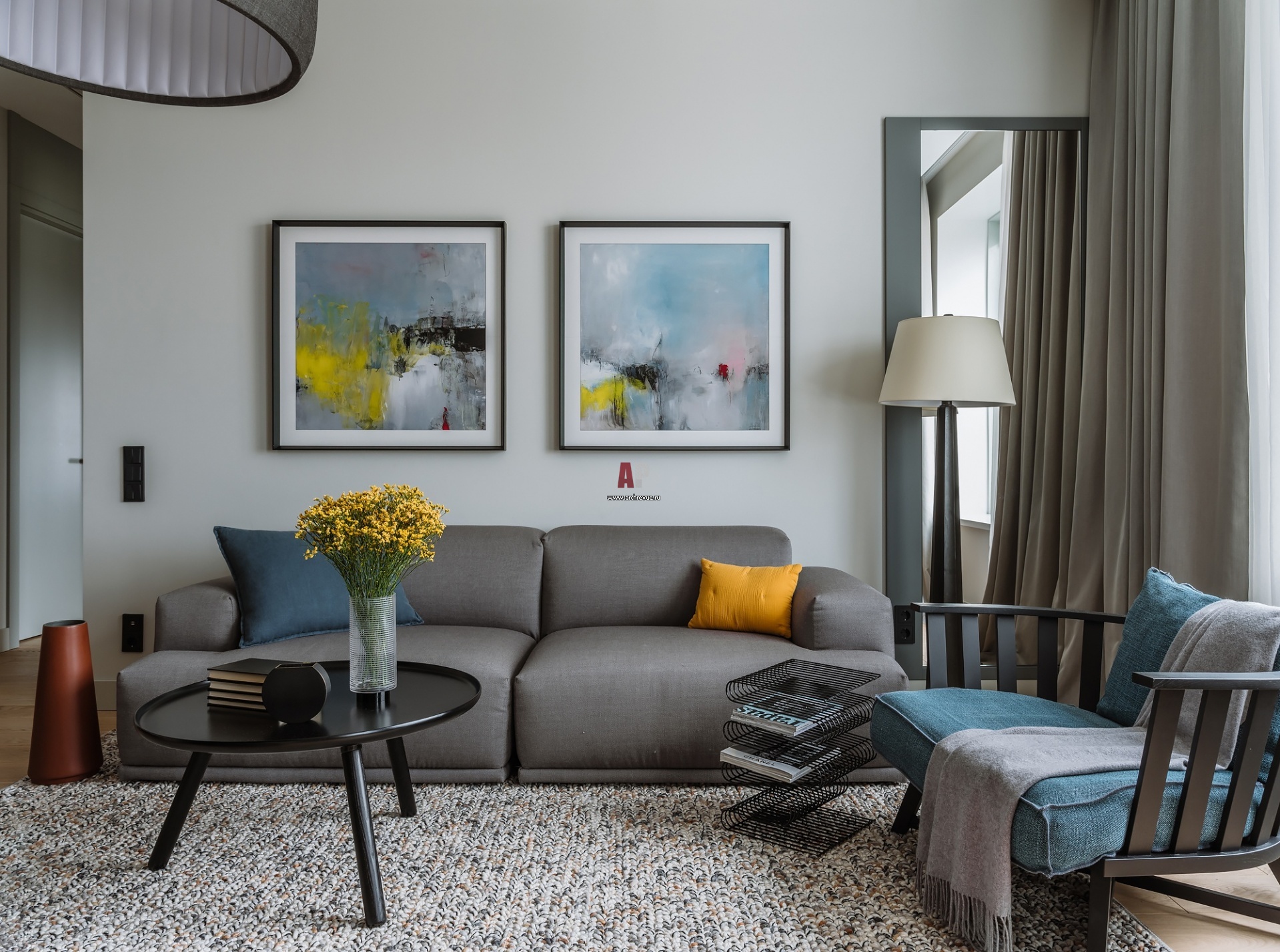 Интерьер гостиной. Стены выкрашены краской Sanderson. На полу – дубовая паркетная доска, Finex. Диван, Muuto. Кресло, Gervasoni. Журнальный стол, Normann Copenhagen. Люстра, Luceplan. Торшер, E. F. Chapman. Картины, Duealberi Abstract Paintings.