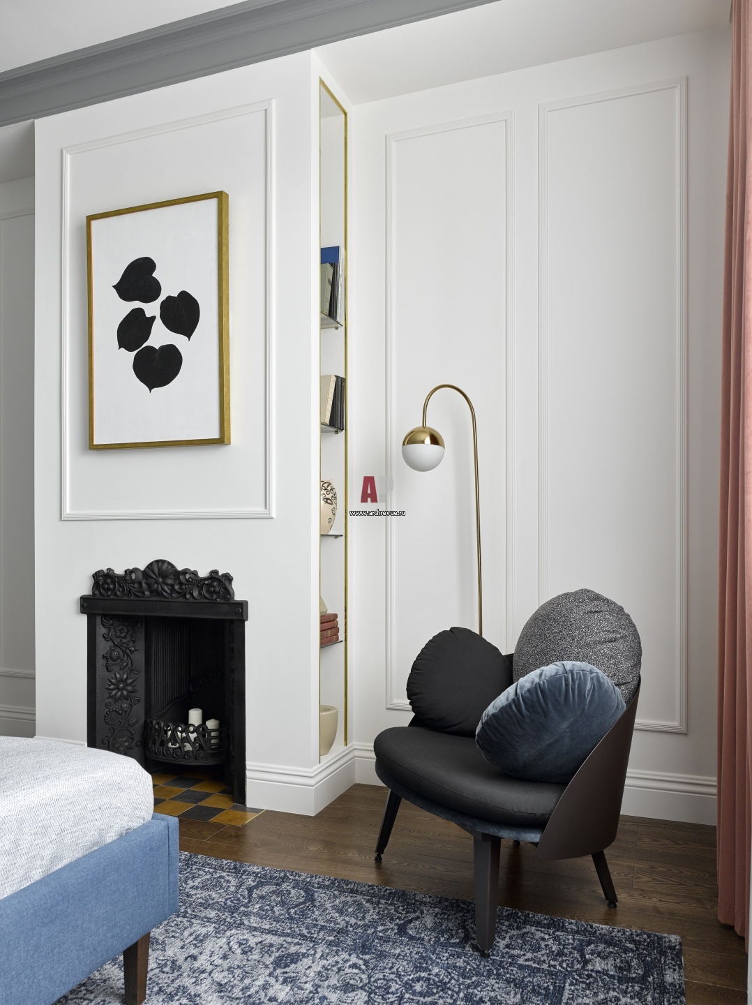 В спальне сделана интересная композиция из встроенных боковых полок и фальш-камина. Основой для него стала старинная печь каслинского литья, купленная на блошином рынке. Кресло, Petite Friture, модель Nubilo.