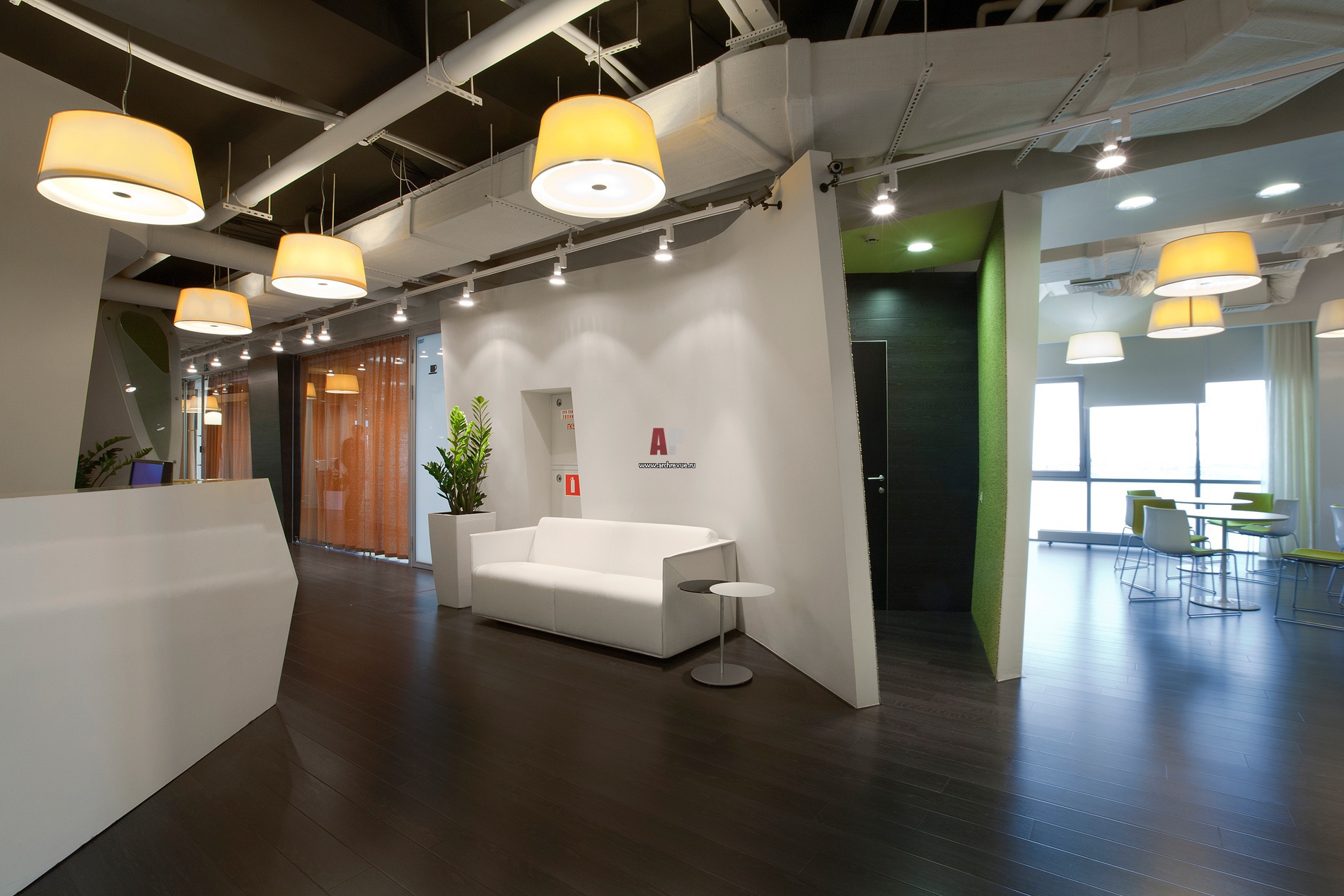 Зона главного входа с ресепшен. Потолки с открытыми коммуникациями выкрашены в белый цвет. По контрасту с ними полы выложены доской из темного дерева. Авторы проекта Петр Зайцев, Арсений Борисенко, архитектурное бюро za bor.