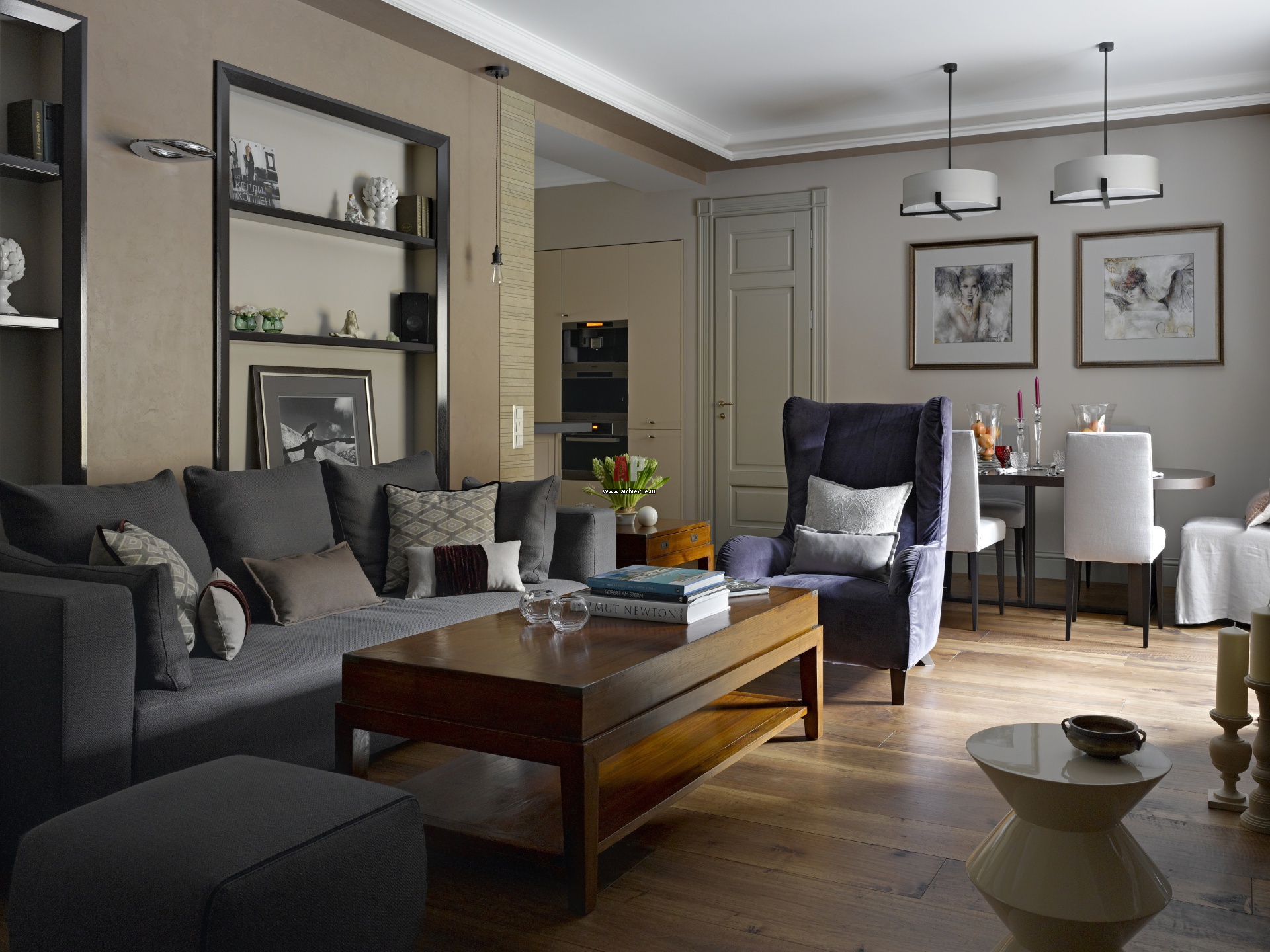 Интерьер проходной гостиной. Небольшое пространство объединено единообразным оформлением потолка декоративной штукатуркой жемчужного цвета. Высокие двери (2,30 м) решены в сером цвете.