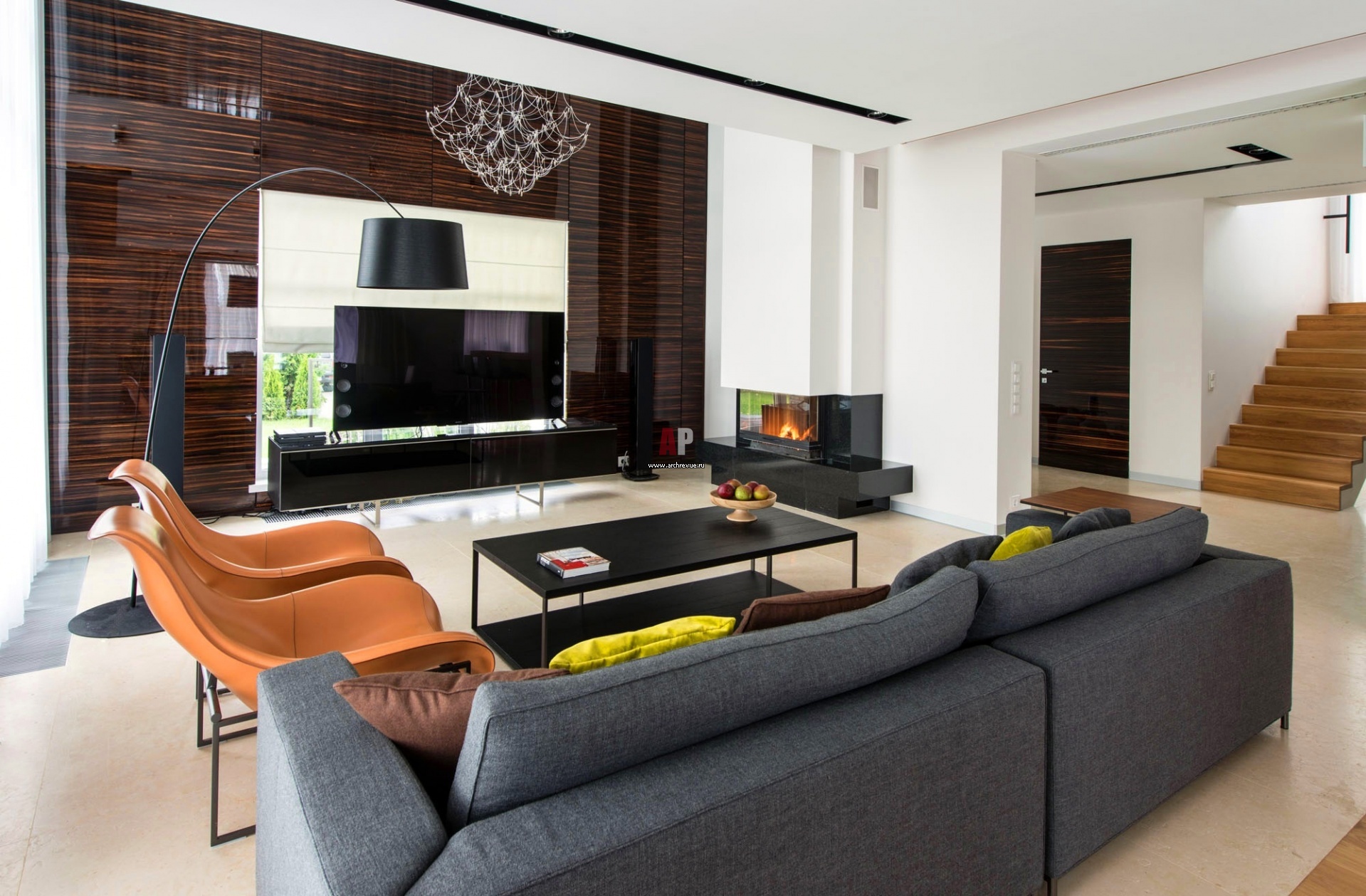 Ниша ТВ в гостиной обрамлена панелями из палисандра. ТВ-панель размещена на фоне окна, которое изолируется с помощью римской шторы из светонепроницаемой ткани. Люстра, Baxter. Торшер, Foscarini. Диван, Minotti. Тумба под ТВ, кресла, B&B Italia. Журнальный столик, Maxalto.