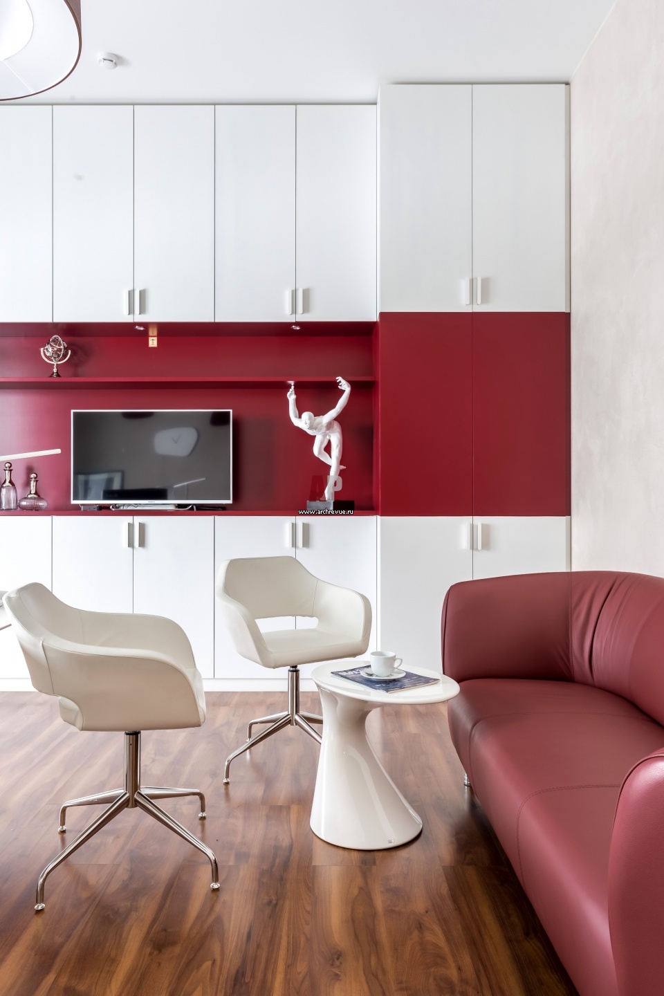 Зона отдыха в кабинете финансового директора. Кожаный диван насыщенного брусничного цвета.