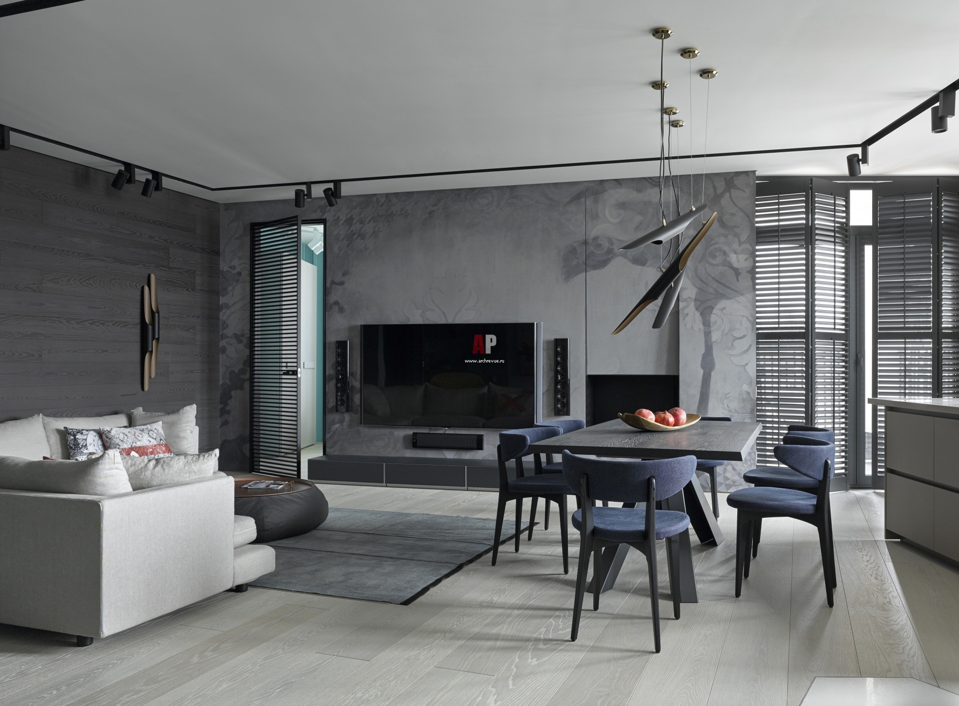 Интерьер студийной гостиной в современном стиле. Панорамные окна оформлены металлическими ставнями, Jasno. Пол и одна стена отделаны паркетной доской.