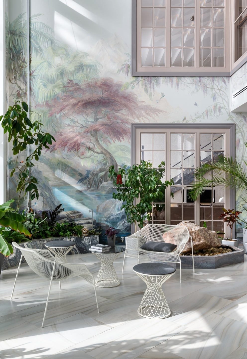 Стены двусветного зимнего сада оформлены художественной росписью работы художницы Еленой Ковалевской. Особенно эффектно выглядит живописный фрагмент площадью 60 кв. м., он объединяет дверной проем и витраж второго этажа.
