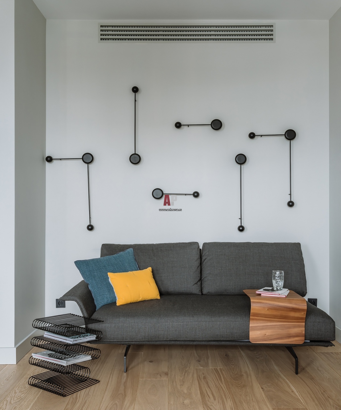 Интерьер гостиной. В нише находится зона отдыха. Диван, Saba Italia. Настенные светильники, Vibia. Журнальница, AYTM.