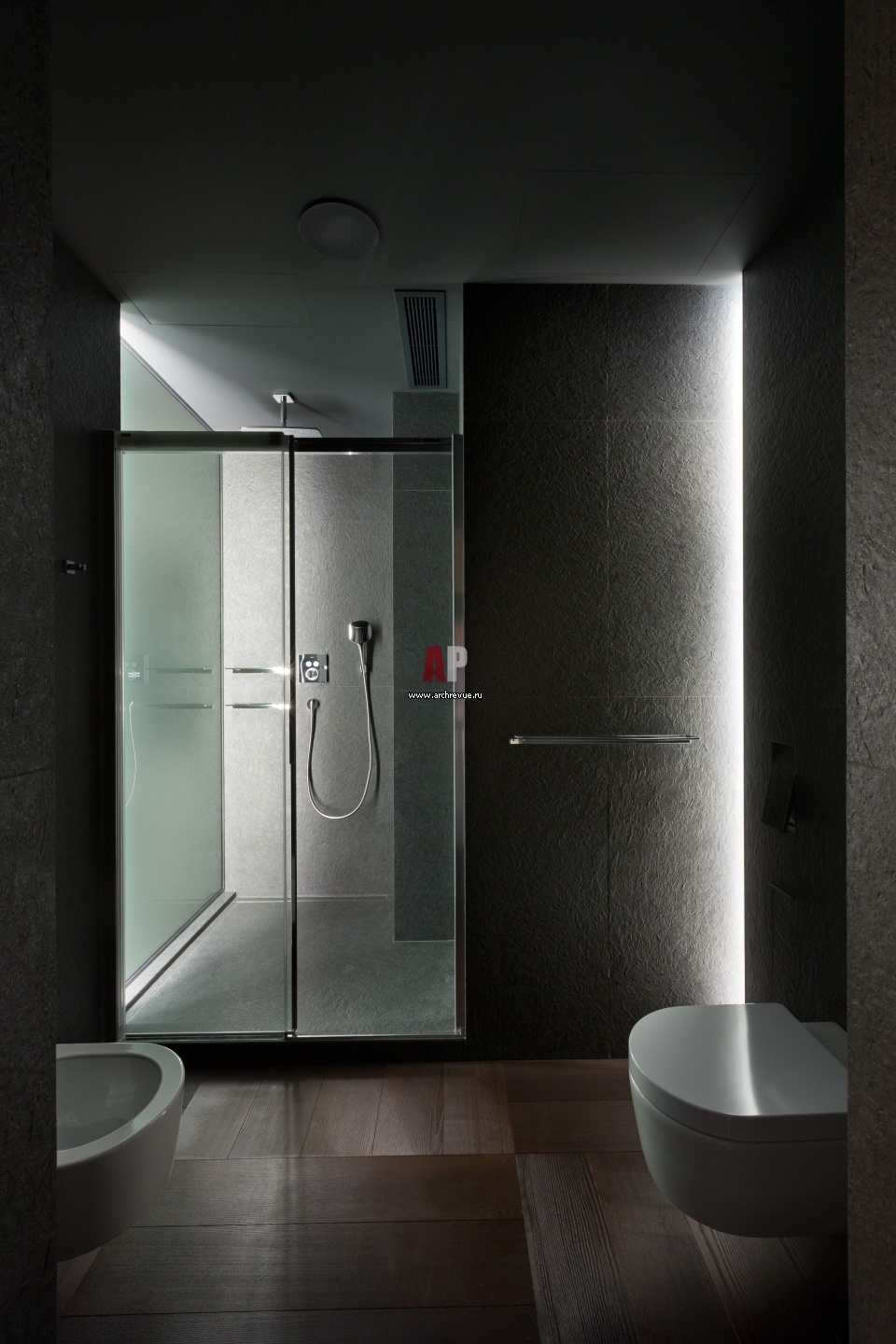 Благодаря отделке «под гранит» санузел выглядит брутально. Сантехника, Antonio Lupi, Duravit.