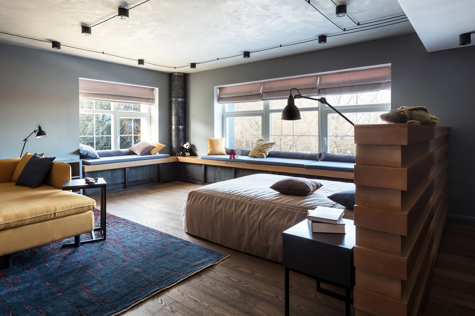 Детская спальня мальчика выполнена в стиле лофт. Стены и потолок – бетон. Вся мебель разработана по индивидуальным эскизам.