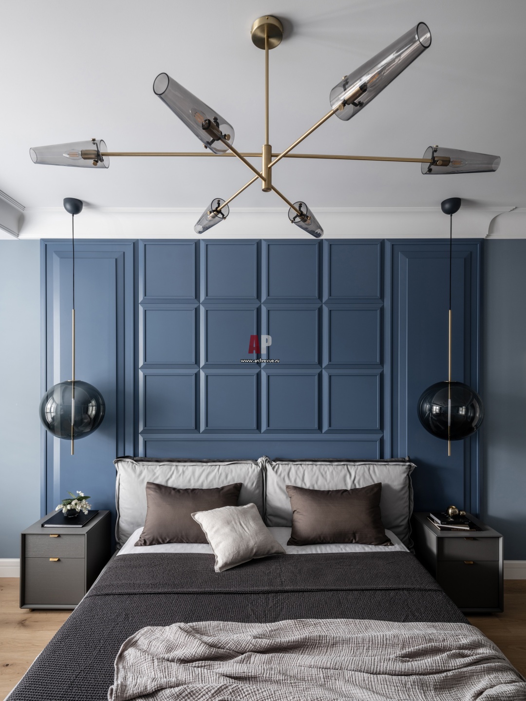 Изголовье кровати оформлено стеновыми панелями с геометрическим рисунком. Стена покрашена краской Argile, оттенок Terre Blue. Потолочный светильник, CTO Lighting.