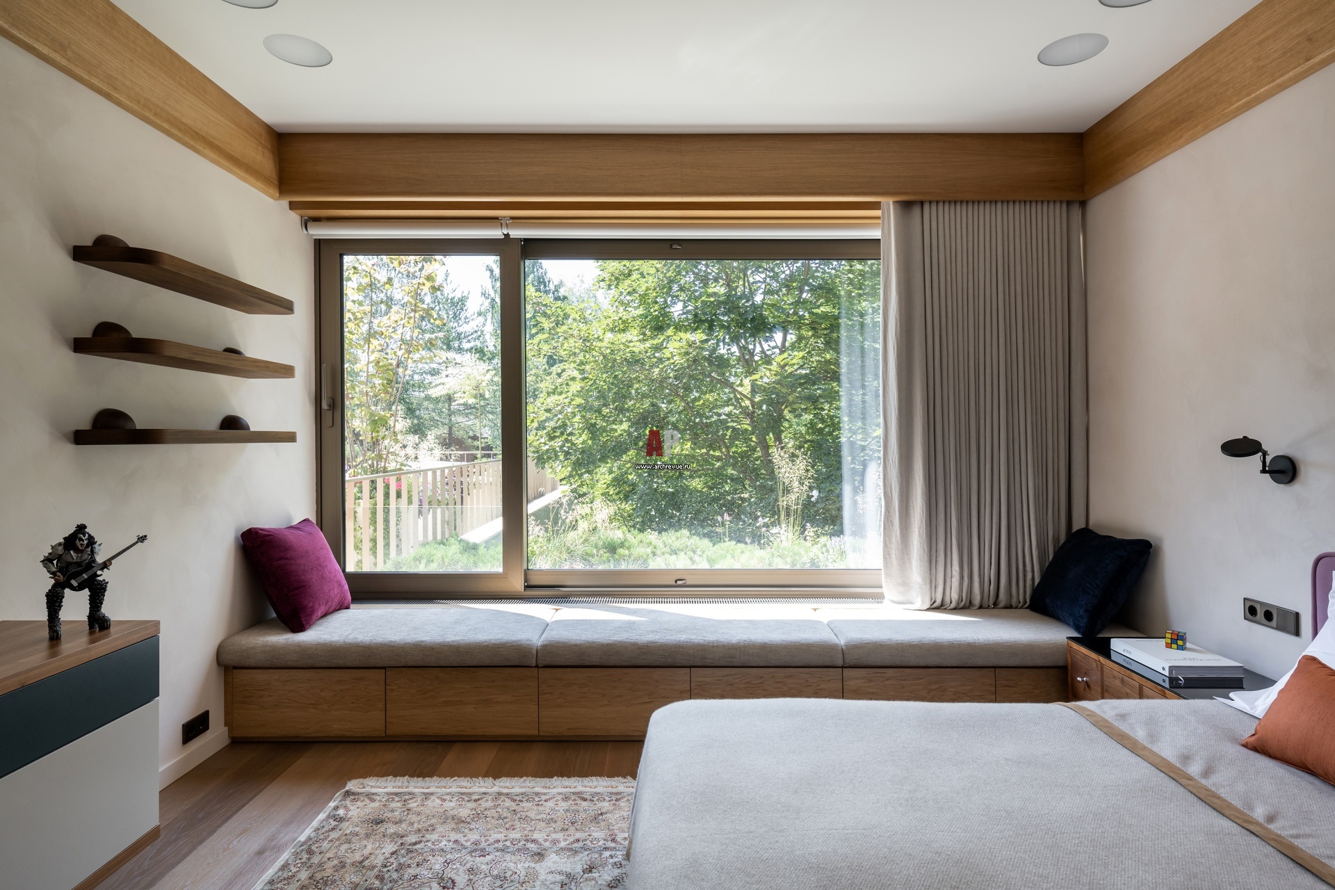 Детская. Вдоль широкого окна установлен мягкий диван для чтения.