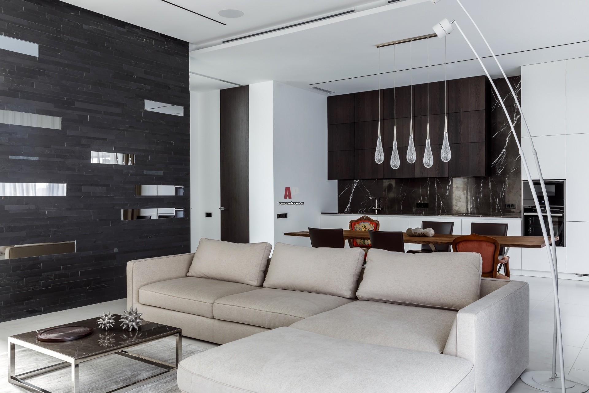 Перегородка между общей гостиной и холлом облицована темным сланцем с зеркальными вставками. Угловой бежевый диван, B&B Italia.