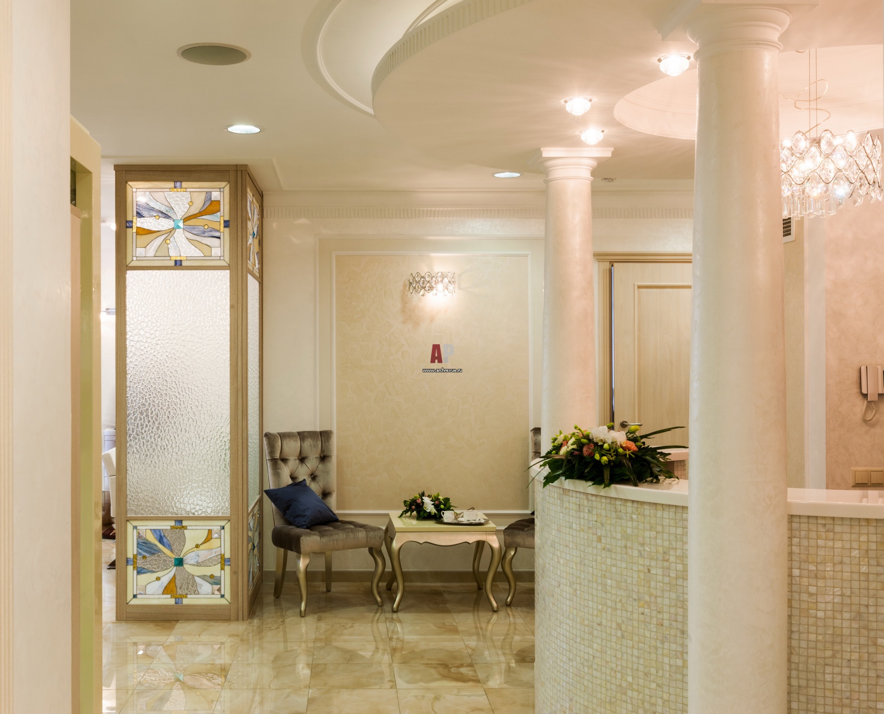 Классические аллюзии читаются в оформлении стойки ресепции – полукруглая конструкция облицована перламутровой мозаикой. С двух сторон она украшена лепными колоннами с лаконичными капителями