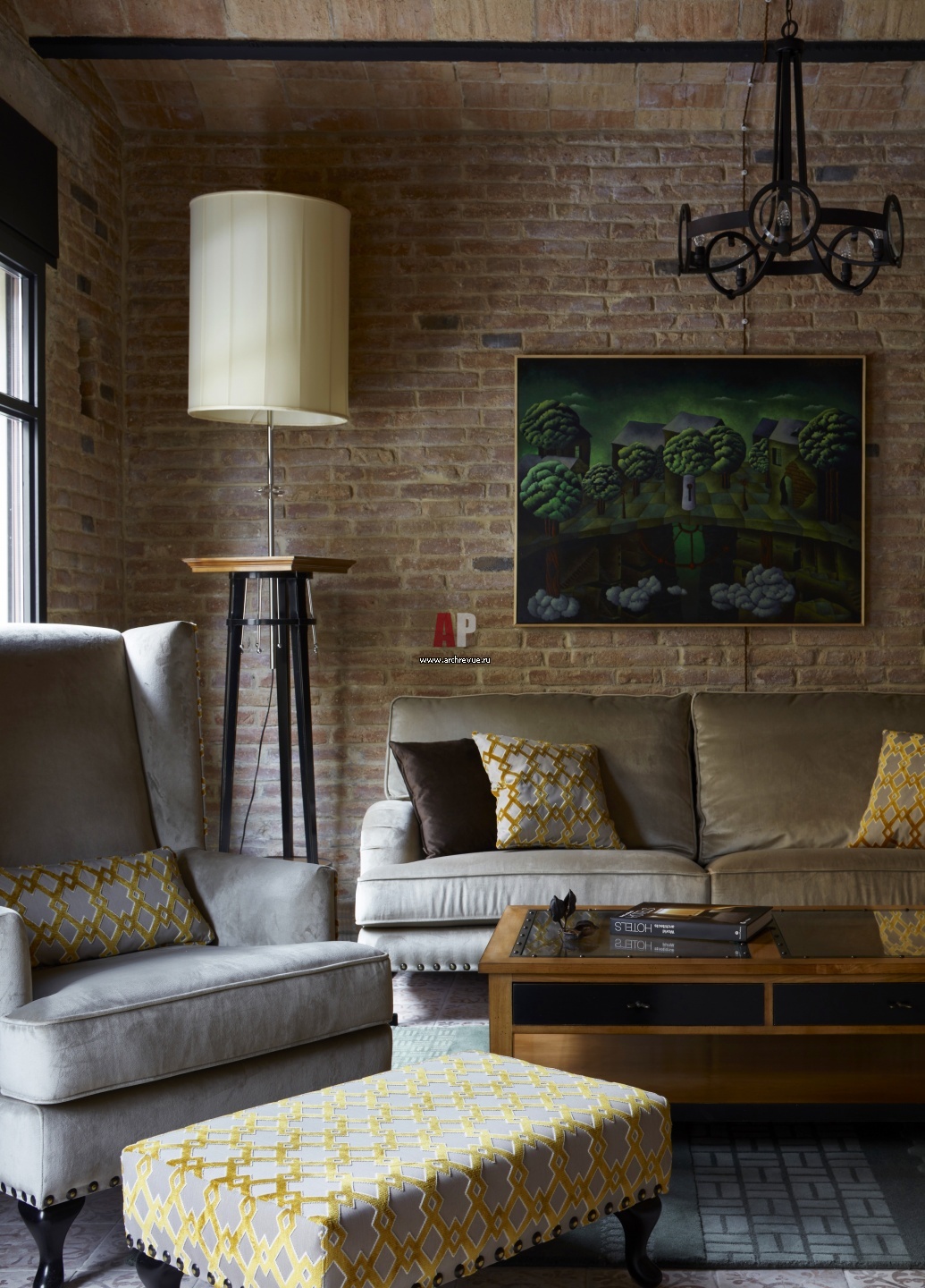 Квартира для семейного отдыха в Барселоне. Интерьер гостиной с кирпичными стенами.