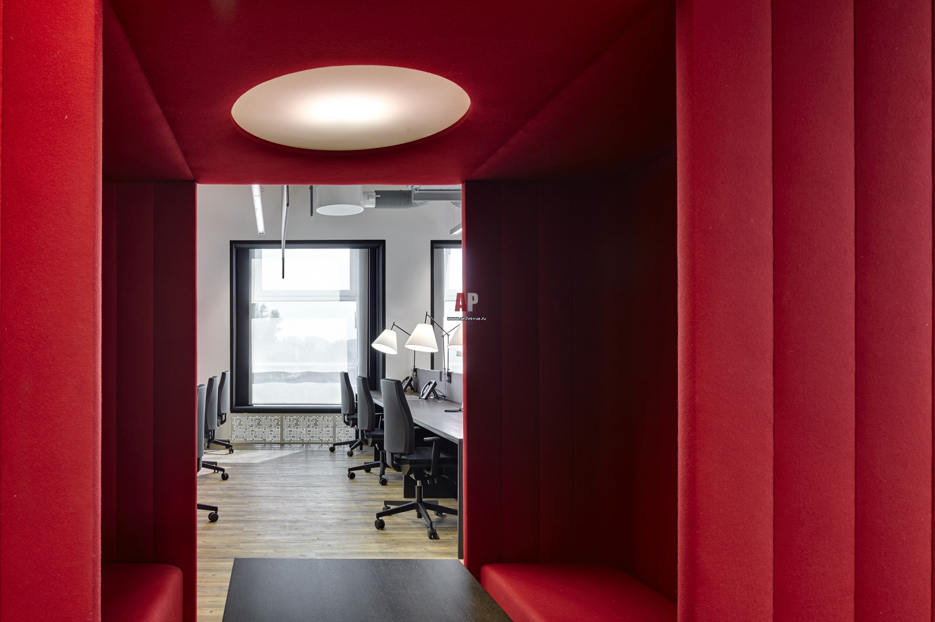 Радиаторы маскируют металлические панели с перфорацией. Подоконники обиты серой тканью и превращены в мягкие лавки.