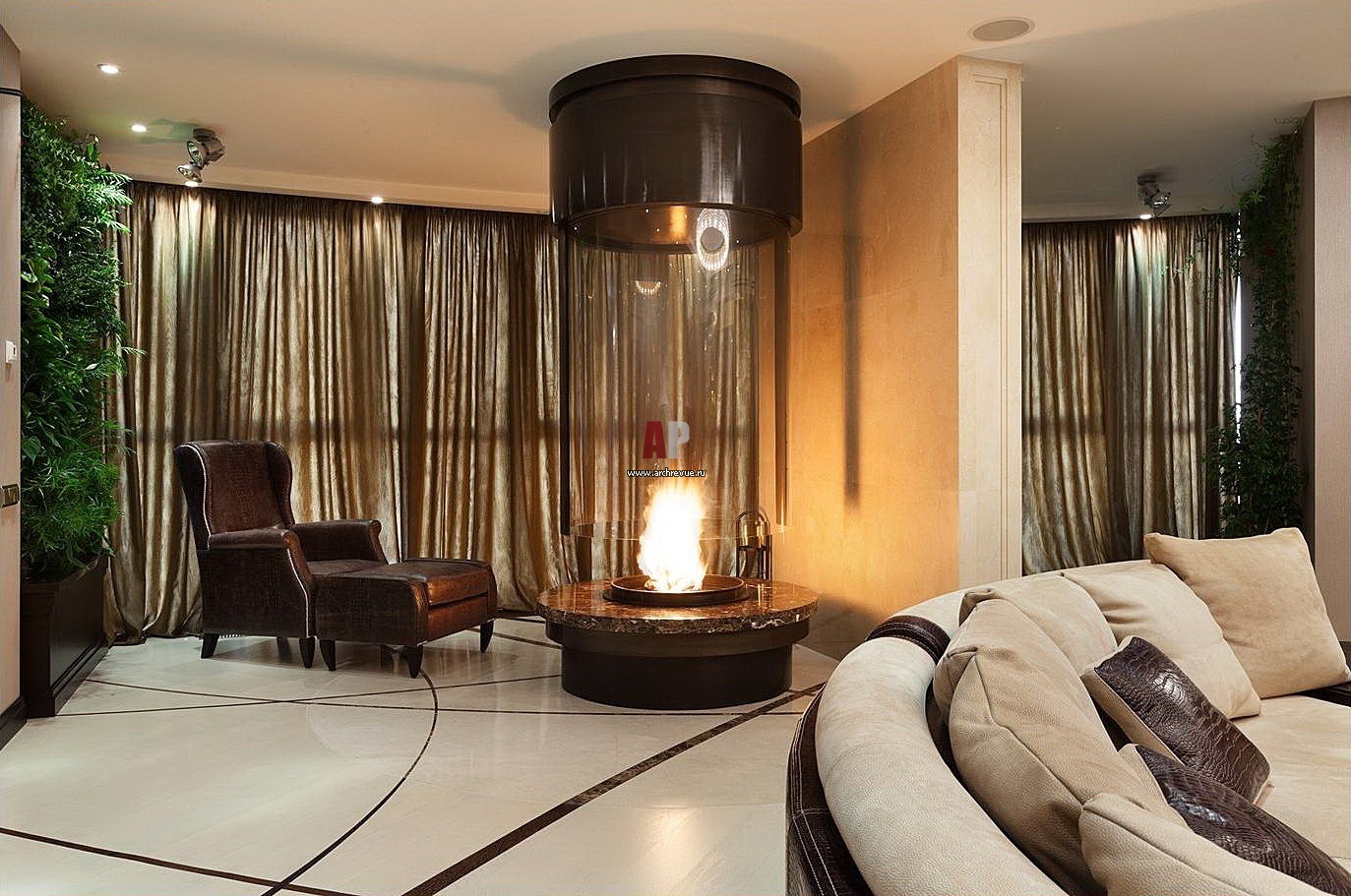 Каминный зал организован на пространстве присоединенной лоджии в форме дуги. Круглый каменный очаг накрыт цилиндрическим дымоходом из закаленного стекла, панорамный камин работает как на гостиную, так и на мягкую группу возле витражного фасадного окна.