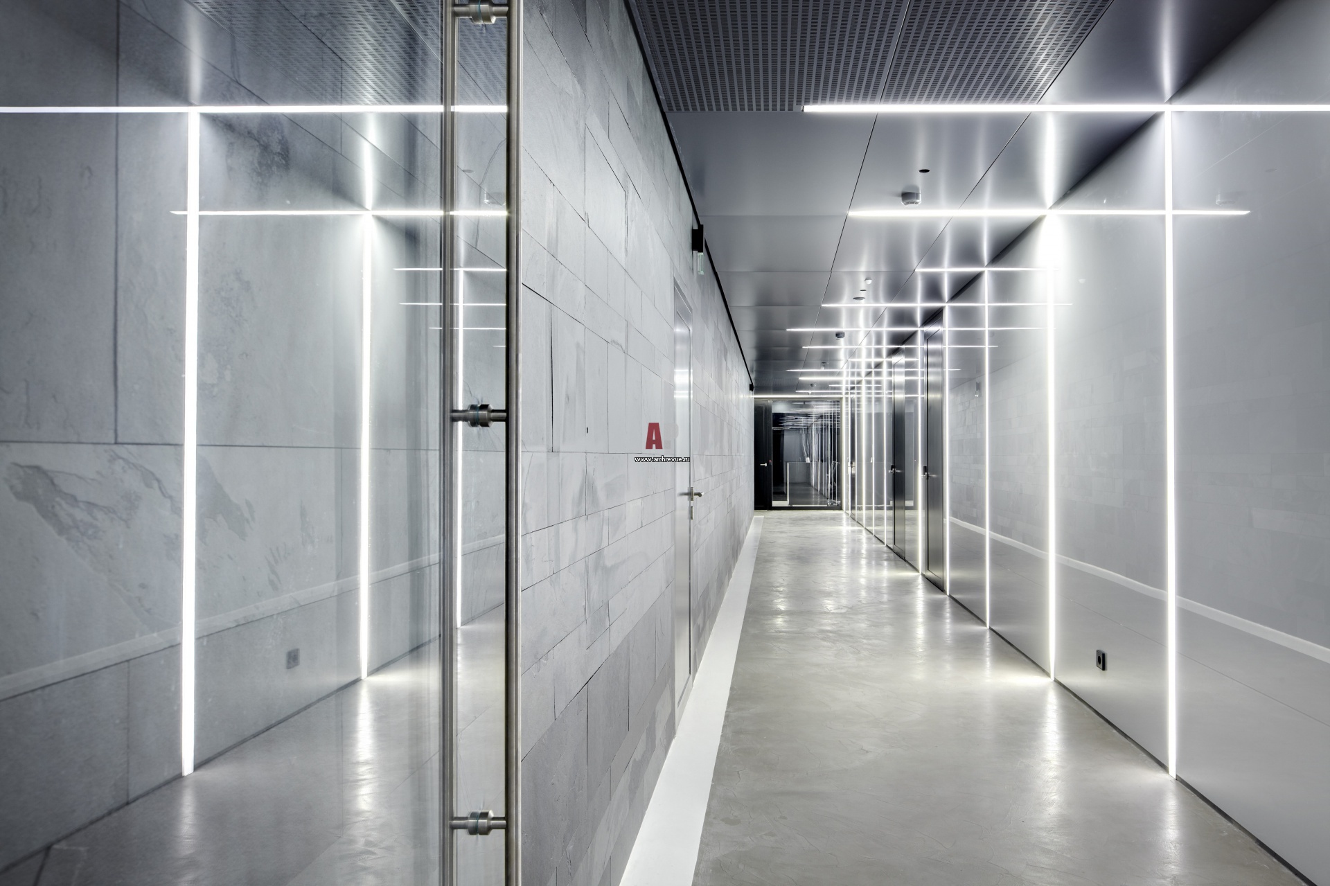 Центральный коридор отделен от остальных помещений противопожарными перегородками с огнеупорными стеклами. Линейные светильники образуют асимметричный световой портал.