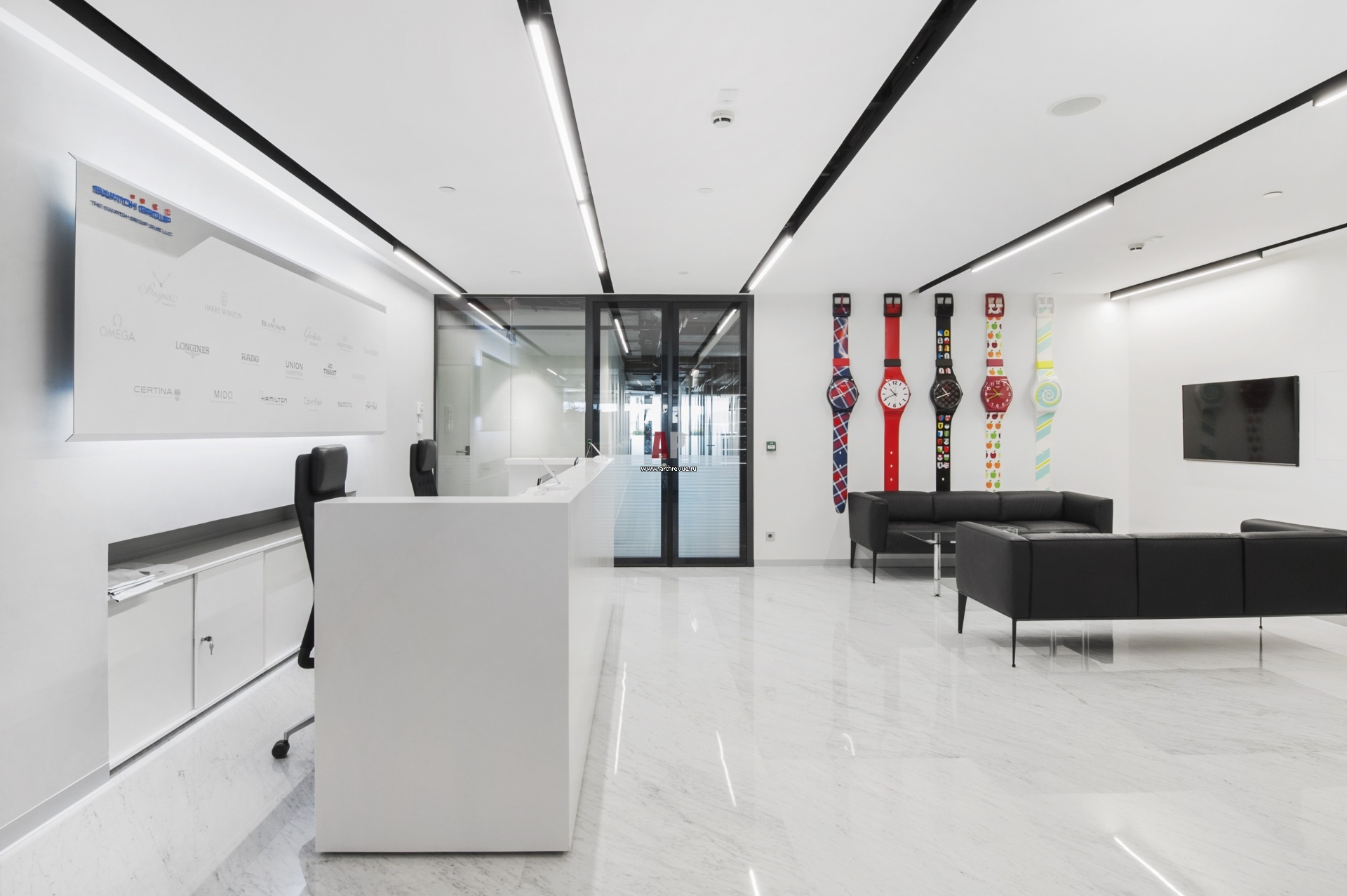 Все потолочные инженерные коммуникации в зоне рецепции были вынесены в смежные зоны (чтобы исключить наличие потолочных лючков), а решетки вентиляции спрятаны в черные ниши со светильниками.