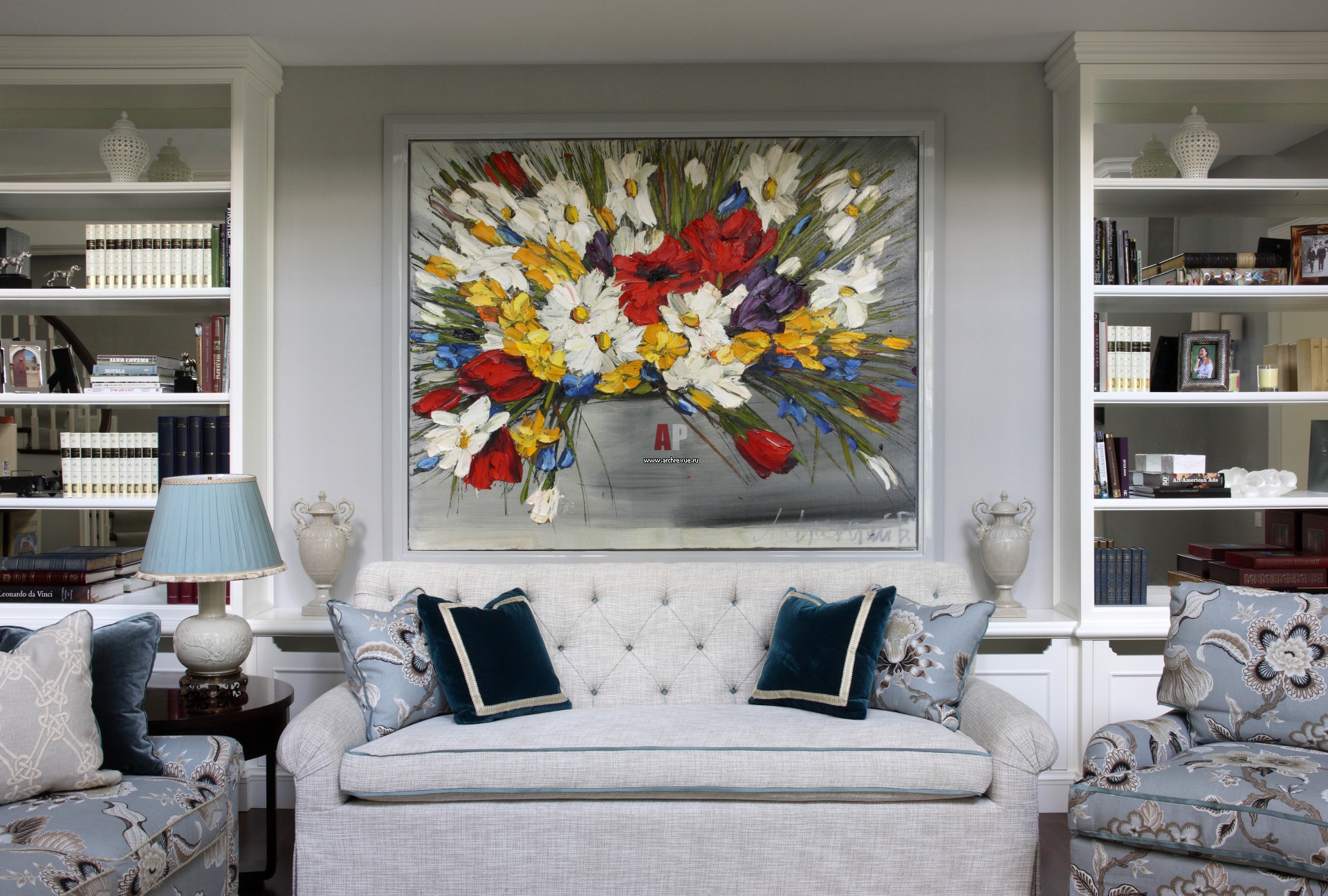 Центральный декоративный элемент гостиной – живописное полотно «Цветы» кисти художника Лаврентия Бруни. Чтобы колористика интерьера и картин идеально сочеталась, в мастерскую художника декоратор приезжал с образцами тканей в руках.