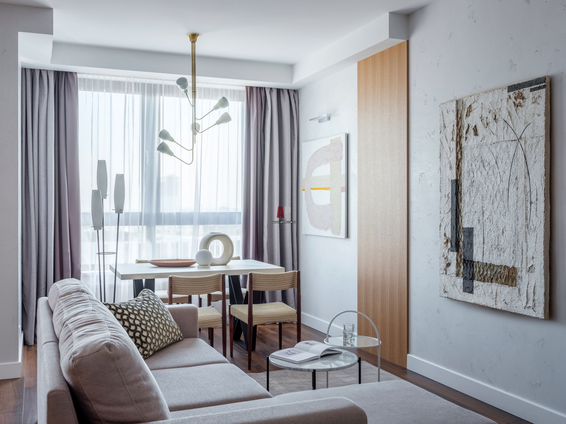 Столовая группа в гостиной. Винтажные стулья, Mobeledom. Картины на стене – художники Наталья Ситникова и Марина Кастальская. Круглая ваза, Redecoration.