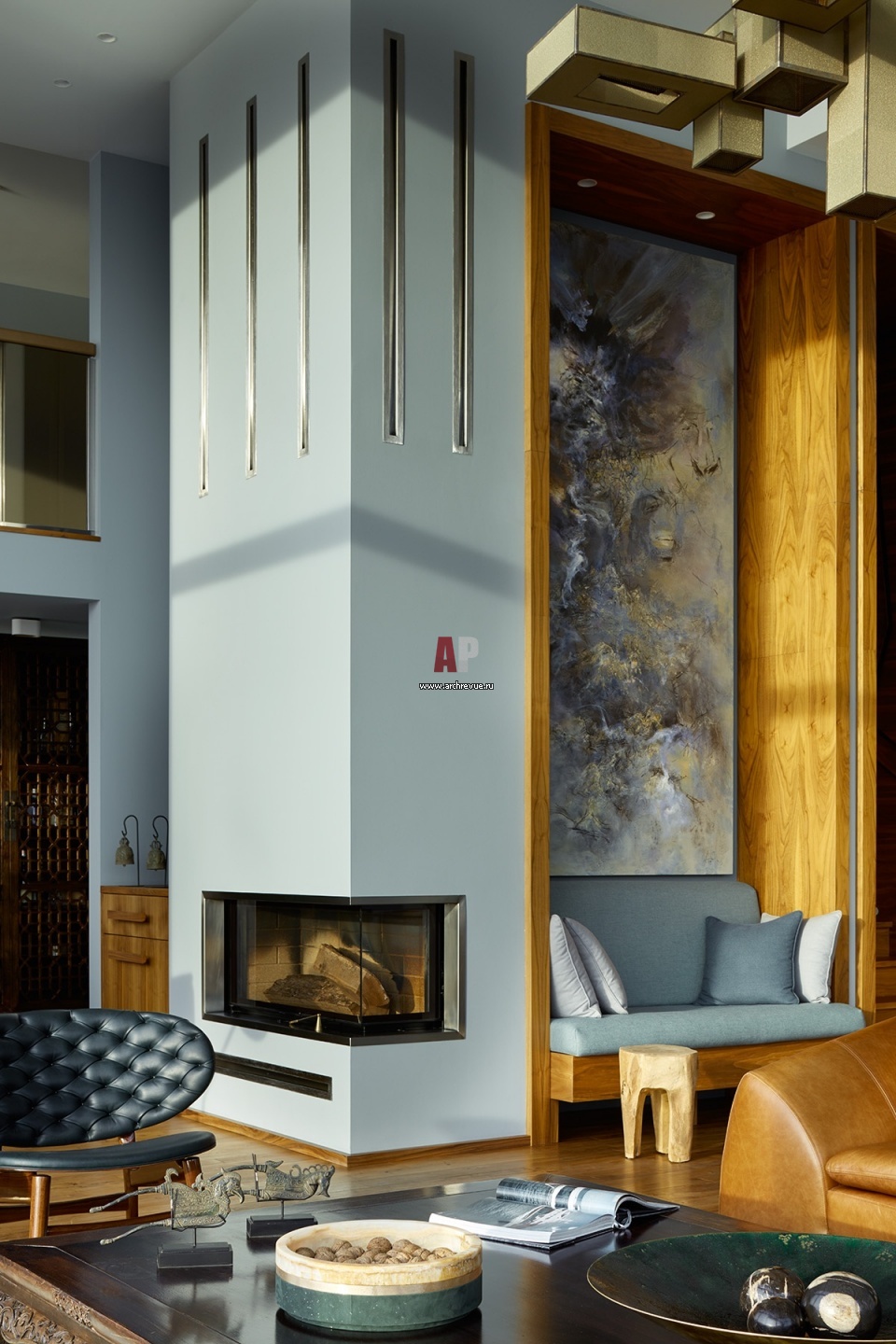 В гостиной установлен современный камин. Кресло, Baxter. Живописные работы – художник Андрей Смирнов.