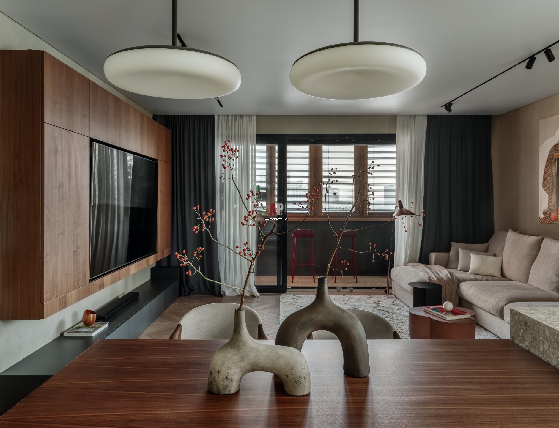 Общая гостиная с видом на утепленную лоджию. Диван, BoConcept. Журнальный стол Konos Studio. Барные стулья на лоджии, Normann Copenhagen. Светильники над столом, AGO Lighting. Композиция под ТВ из шпона ореха.