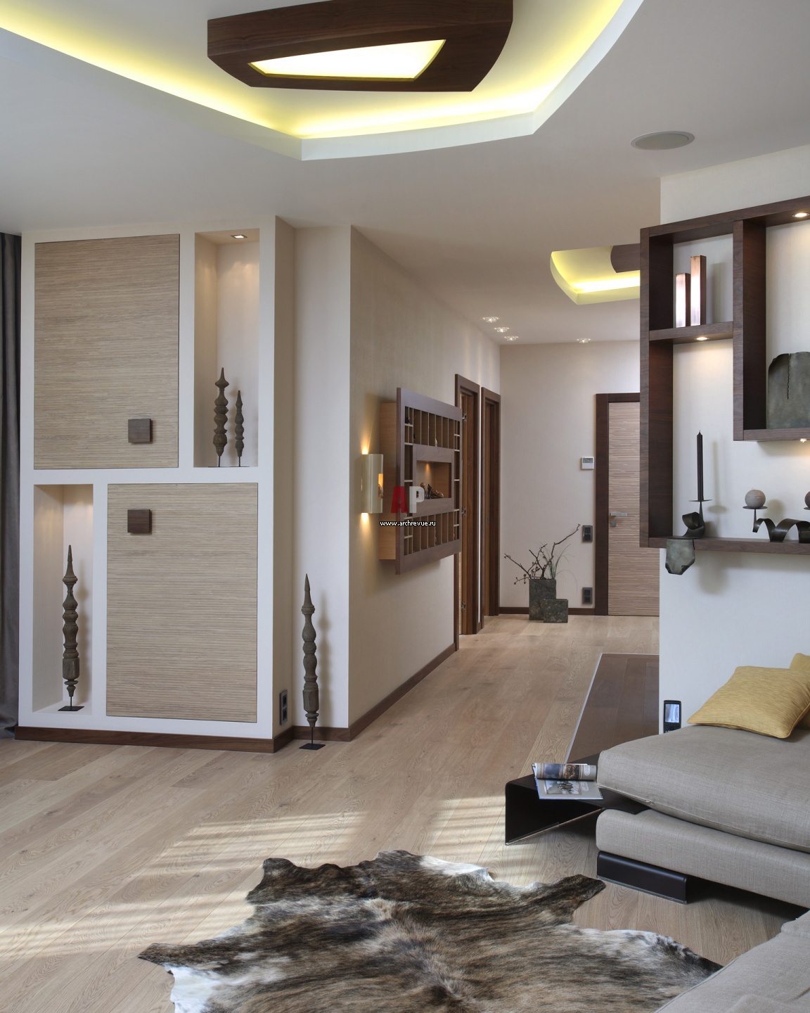 Фото интерьера гостиной с отделкой деревом двух пород: американским орехом (плинтусы, фурнитура) и выбеленного фрезерованного ясеня (фасады авторской мебели, все двери в квартире). На полу – доска из ясеня под лаком, поставщик «Мир Паркета». На стенах – виниловые обои под покраску.