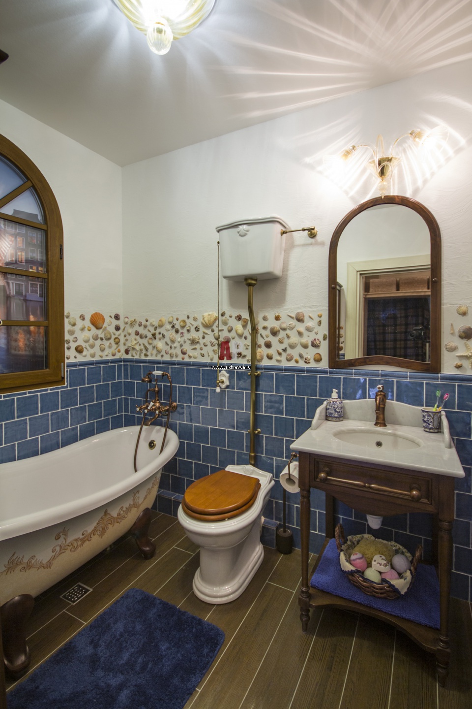 Интерьер санузла в стиле кантри. Низ стен по периметру помещения облицован керамической глазурованной плиткой ярко-синего цвета. Верх выкрашен в белый цвет и оформлен ракушками, привезенными из путешествий.