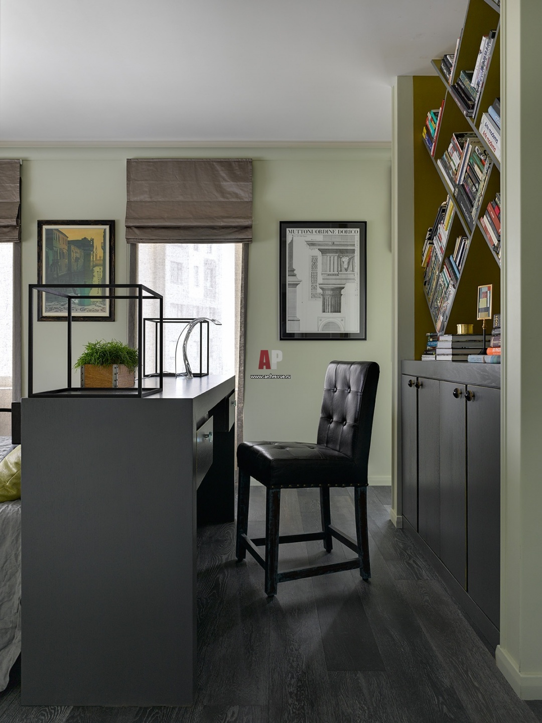 Рабочая зона в спальне. Стол сделан по эскизам, он адаптирован для работы с гаджетами, оснащен удобным доступом к разъемам для зарядки устройств.