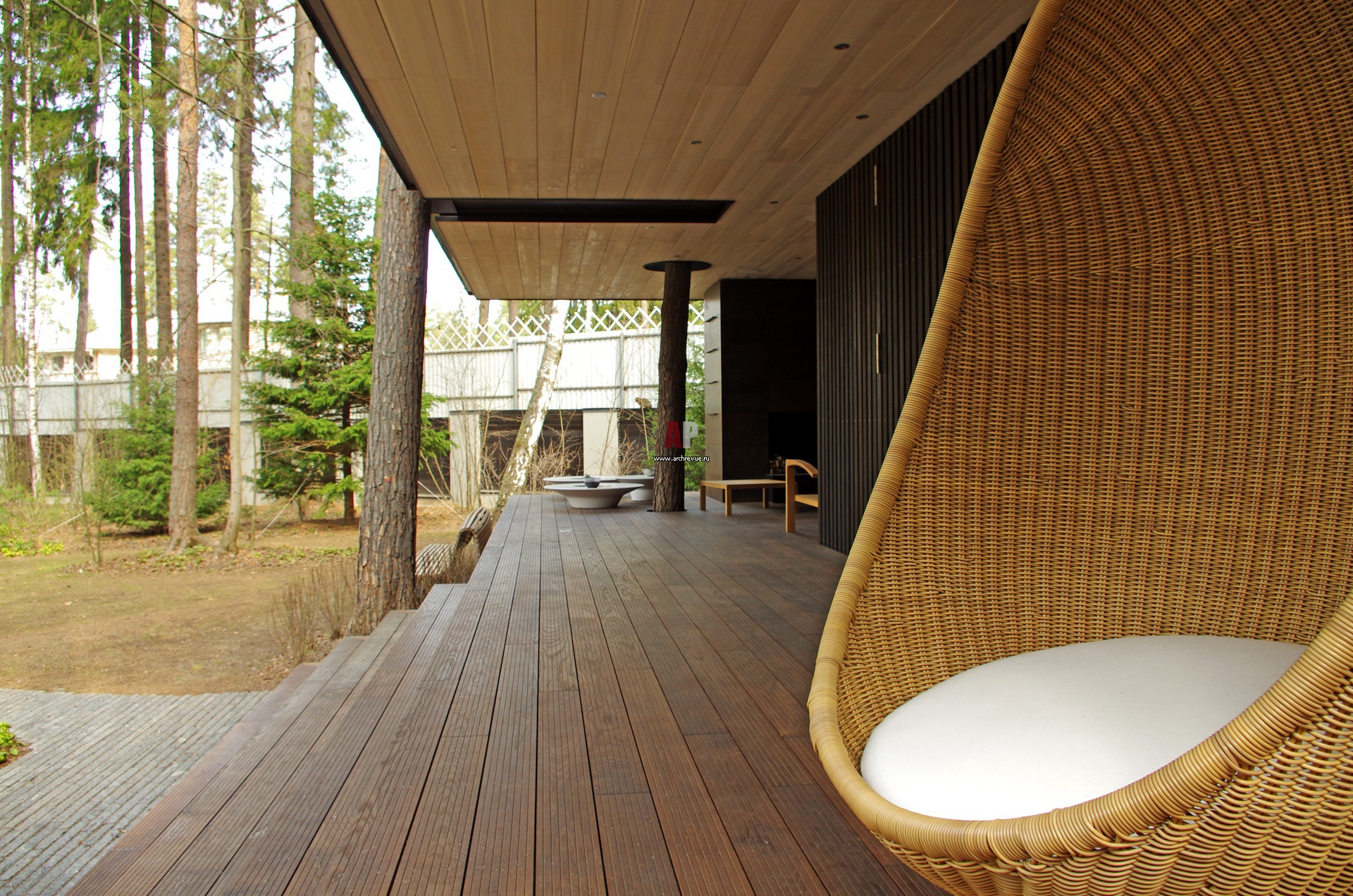 Зона отдыха на веранде. Качели в виде кокона выполнены из ротанга.
