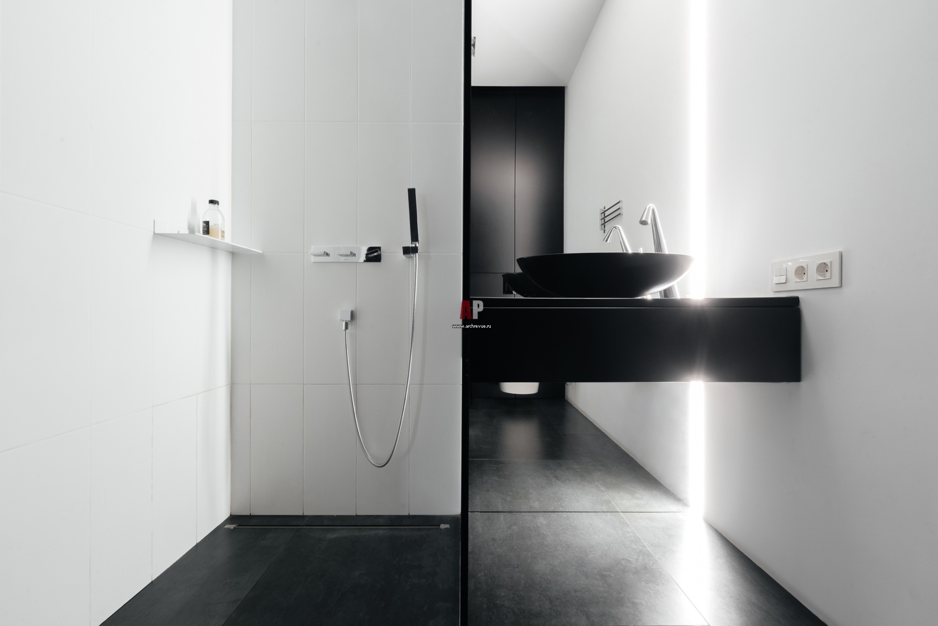 Гостевой санузел оформлен в черно-белой гамме. На стенах – белая плитка, ItalON, сама же сантехника – черная. Смеситель, Gessi. Душевой трап, Viega.