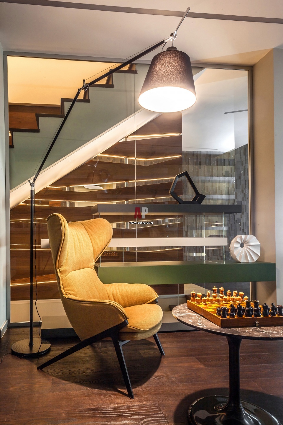 Перегородка из деревянных элементов пронизывает насквозь два этажа и объединяет собой пространство дома по вертикали. Кресло, Minotti.