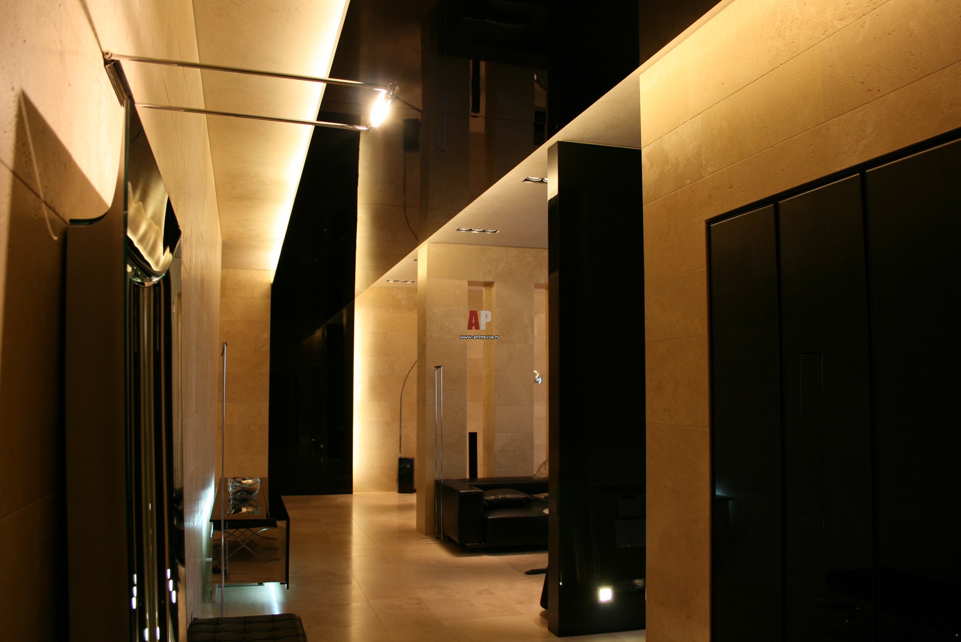 Чтобы подчеркнуть геометрию пространства, авторы используют закарнизную и точечную подсветку, а также дизайнерские ультрасовременные светильники, поставщик «Люминатор».