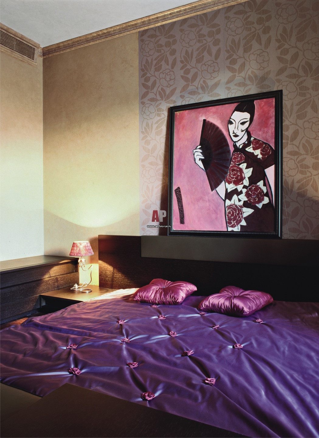 В отделке гостевой спальни присутствуют фиолетово-сиреневые тона. На стене в изголовье кровати – картина работы художника Инны Бажутиной.