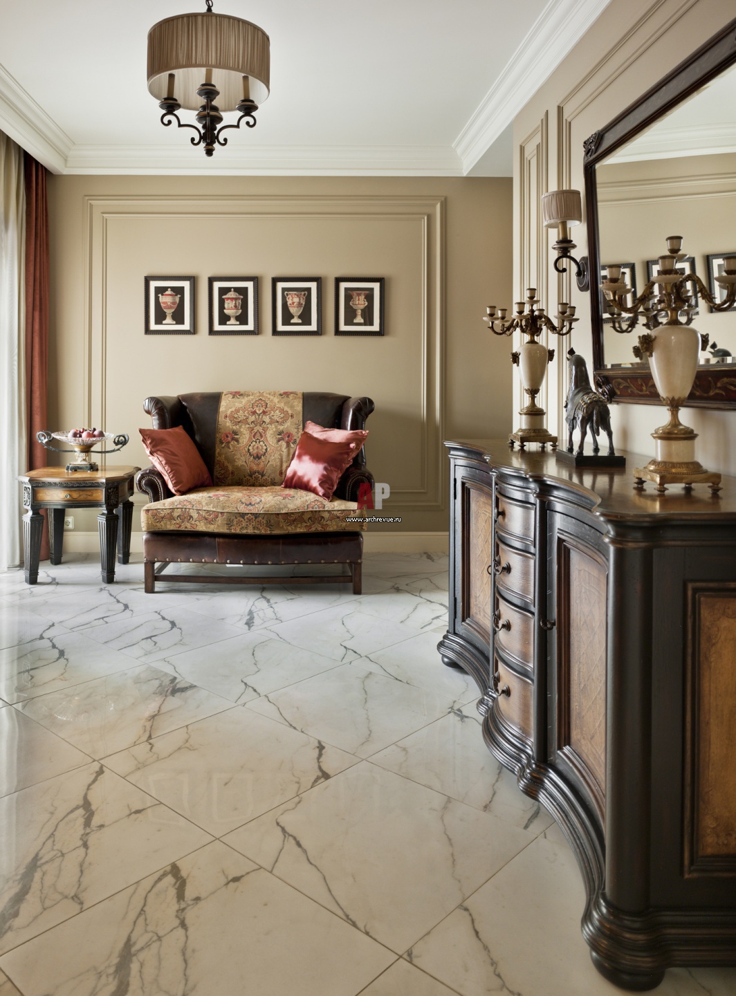 Интерьер прихожей в традиционном американском стиле. Пол холла выложен плитами керамического гранита от фабрики Rex (коллекции I bianci), имитирующего мрамор, поставщик BARS RED.