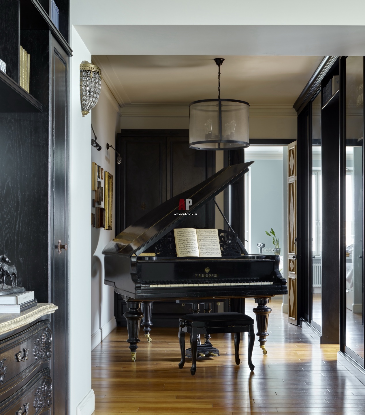 В холле нашлось место не только библиотеке, но кабинетному роялю. На полу – доска из тика. Встроенная мебель, двери, «Ассоциация русских мастеров».