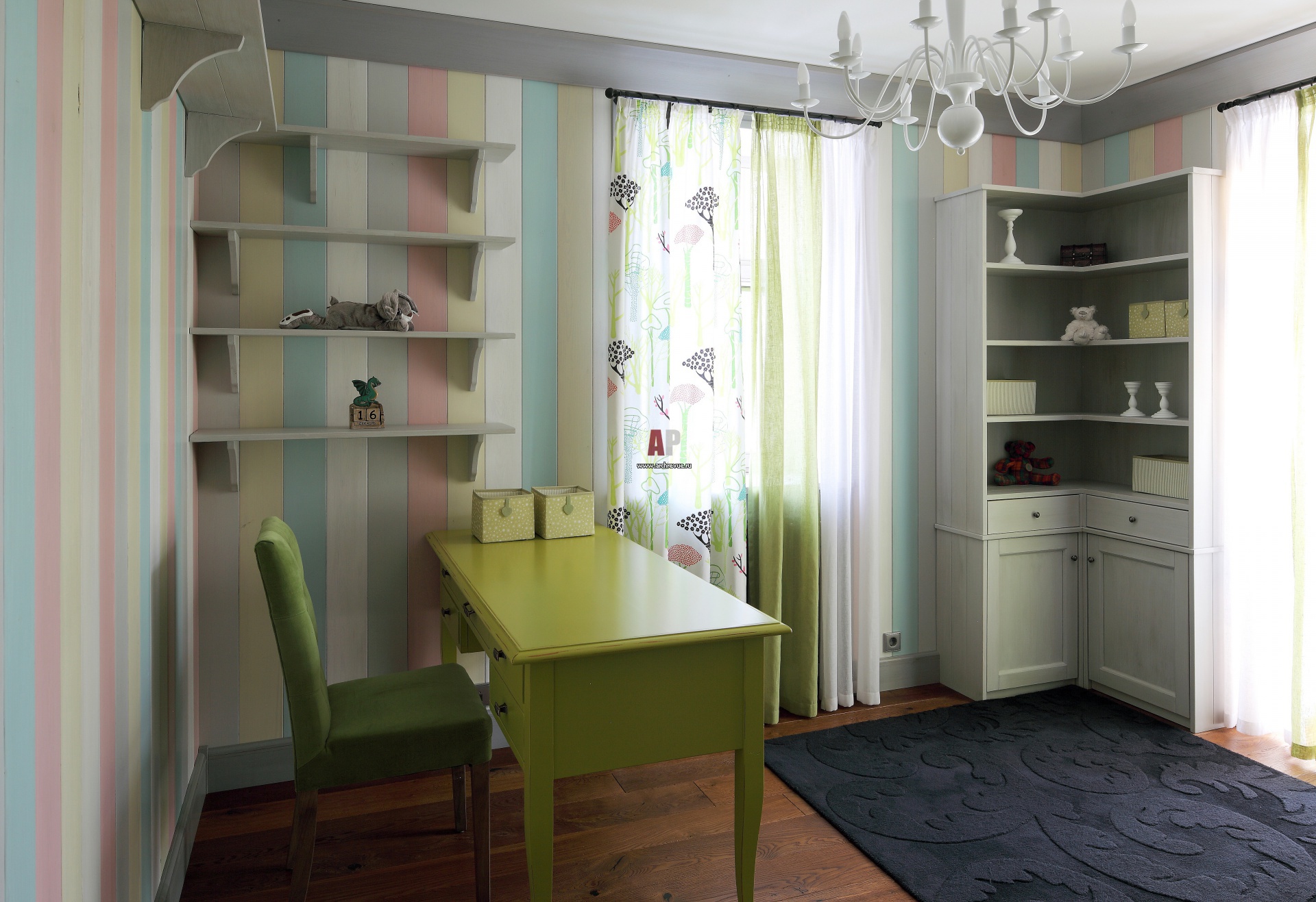 Стены детской комнаты зашиты вертикальными деревянными панелями, выкрашенными в разные цвета.