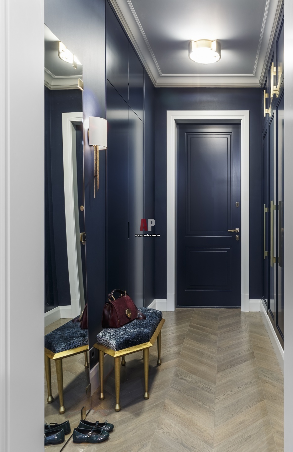 Интерьер прихожей выполнен в насыщенной синей гамме, которая по мере продвижения по квартире сменяется более пастельной серо-голубой.