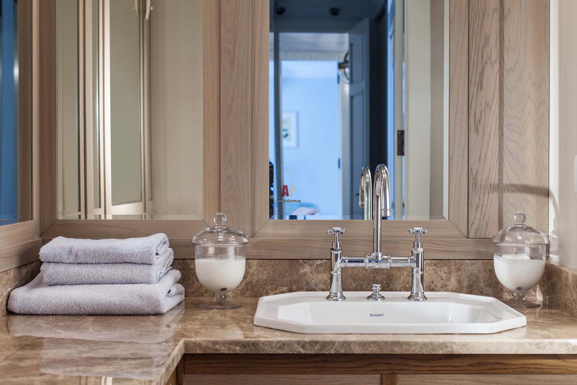 Небольшая хозяйская ванная комната. Столешница умывальника из бежевого мрамора. Сантехника, Duravit.