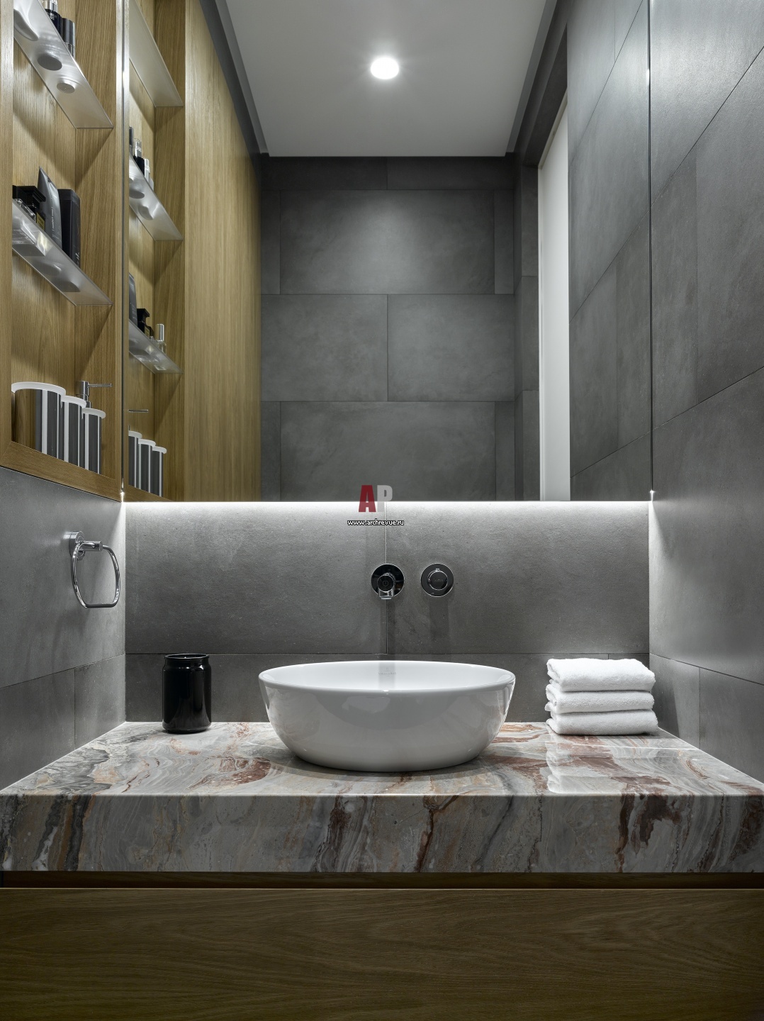 Гостевой санузел. На стенах – плитка с фактурой серого камня. Столешница из мрамора. Раковина, Villeroy & Boch, модель Artis.