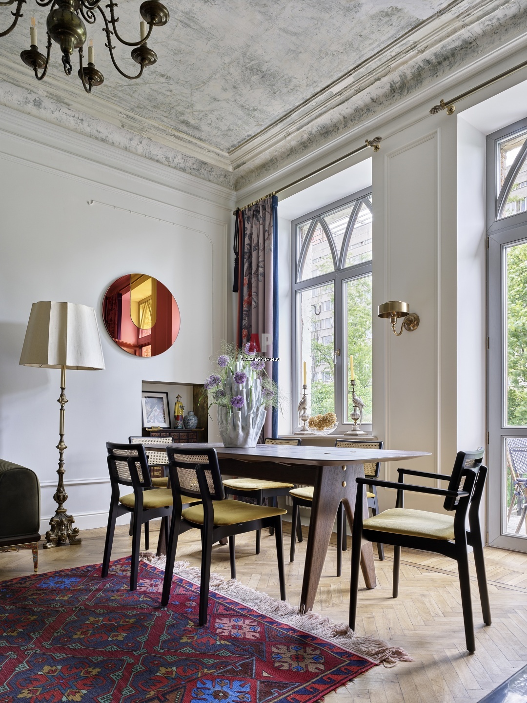 Историческая квартира в бывшем доходном доме Ростова-на-Дону. Интерьер столовой. Обеденная группа, настенные бра, зеркало, Versmissen. Декоративная ваза-коралл, Pols Potten. Подсвечники-птицы, G&C Interiors.