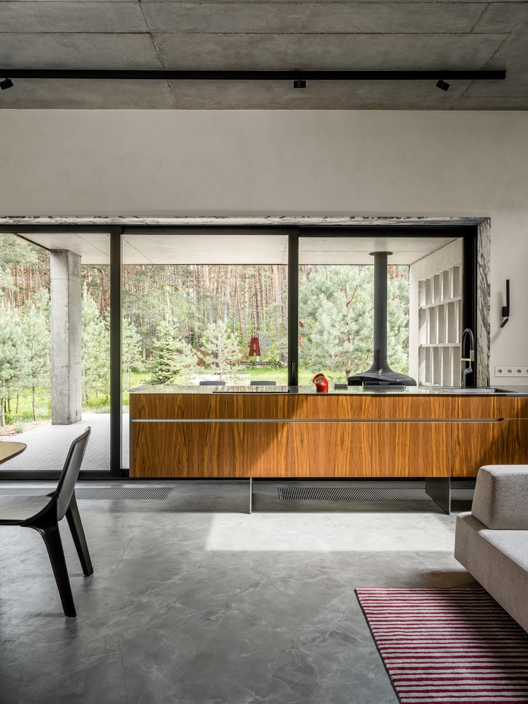 Кухонная мебель предельна лаконична. Модуль с рабочей поверхностью, плитой и мойкой будто парит в воздухе.