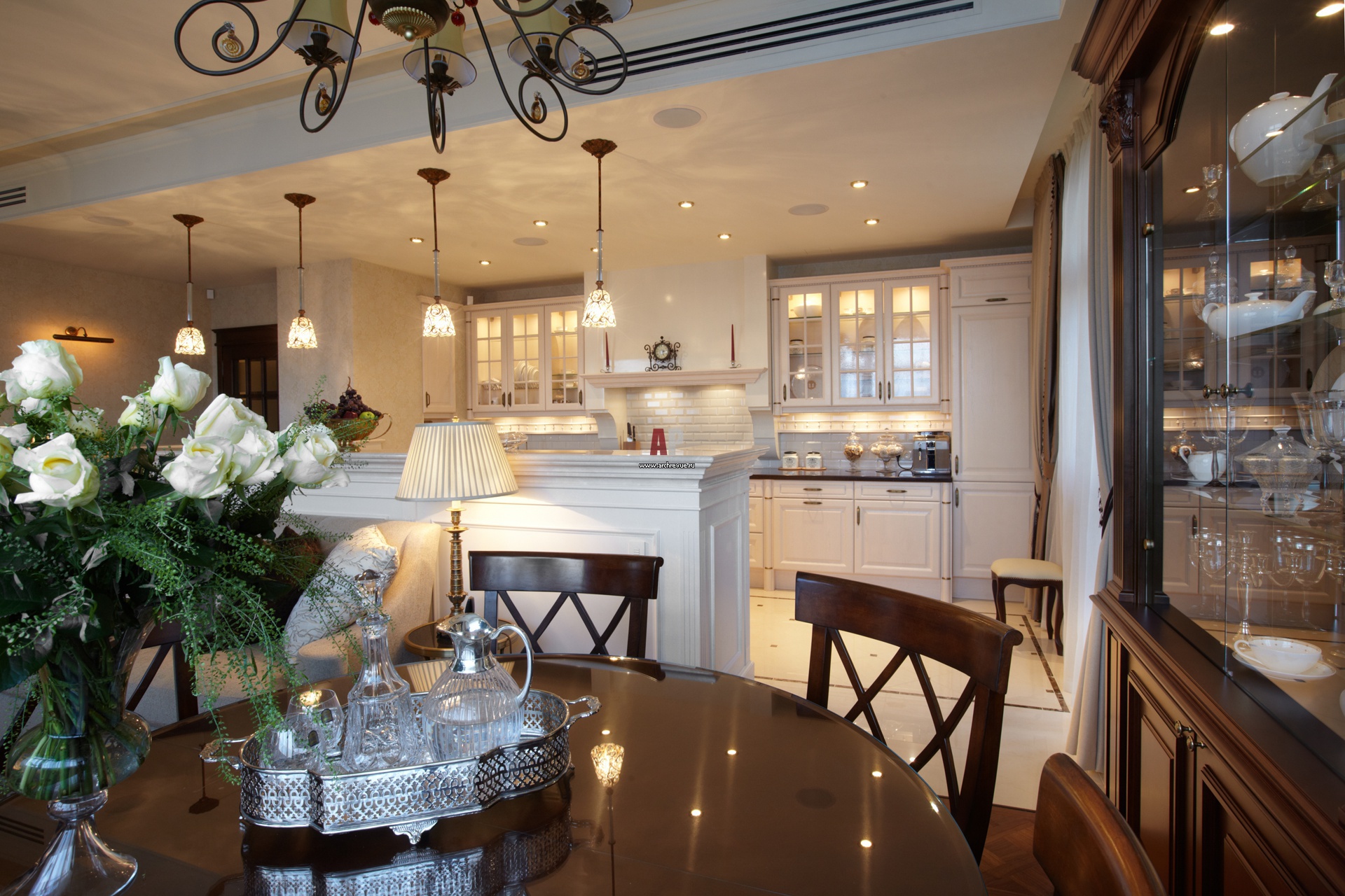 Вид со стороны столовой группы на кухню. Кухонный гарнитур Mobalpa выполнен в классике. Стеклянные створки навесных полок украшены деревянной раскладкой.