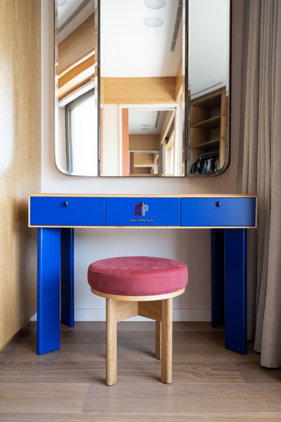 Хозяйская спальня, гардеробная и ванная комната образуют анфиладу. Мебель изготовлена на заказ.